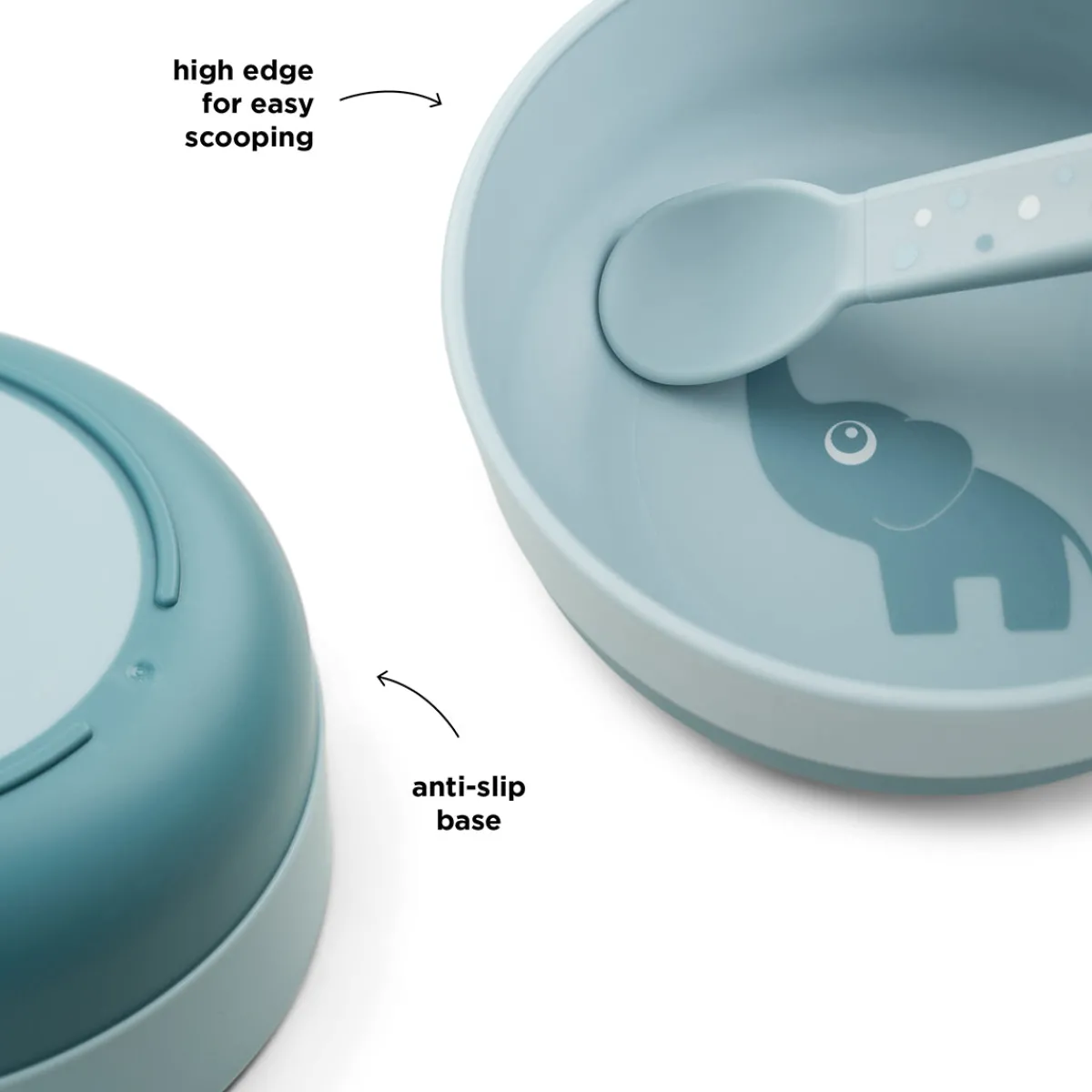 Skålsættet er perfekt til småspisere og indeholder en skål, en kop med tud og et bestiksæt.