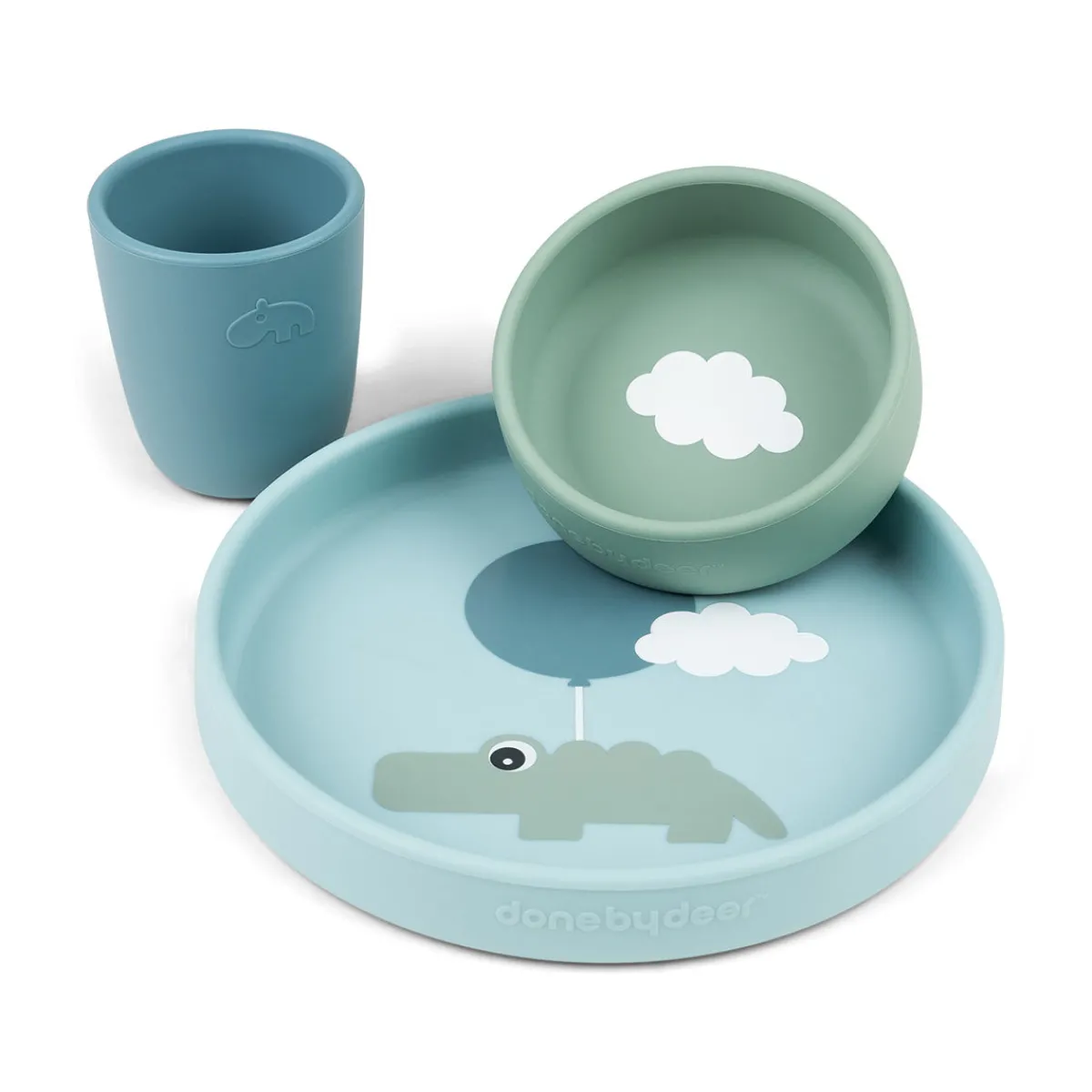 En blå Croco-tallerken, en grøn sky-skål og et mørkeblåt minikrus gør dette børnemåltidssæt til en perfekt gaveidé til småspisere.