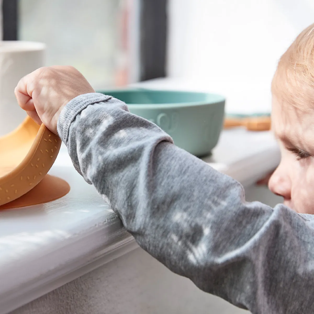 Dæk et sjovt bord med Silikone Stick&Stay spisesæt og Lalee som en cool ledsager. Tallerkenen med sennep, den grønne skål og minikruset med sand er dekoreret med prægede mønstre med Lalee, Birdee, festlig confetti og kriblende kaktusser.