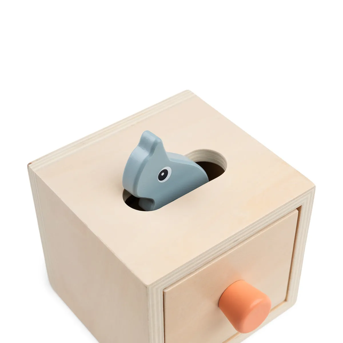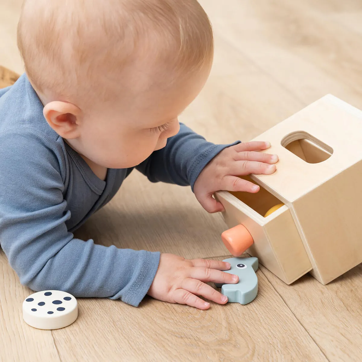 Lad dit barn se og lære, når ting forsvinder, hvilket øger glæden ved at opdage og styrker forståelsen. Boldens ranglende lyd giver auditiv stimulering, og når du vender æsken, får du en mere udfordrende hulform. For ekstra sjov kan du bruge et legetørklæde eller en klud til at trække tingene ud. Fremstillet af ansvarligt indkøbt træ og malet med sikker, vandbaseret maling, hvilket sikrer en sikker og sjov legeoplevelse for dit barn.