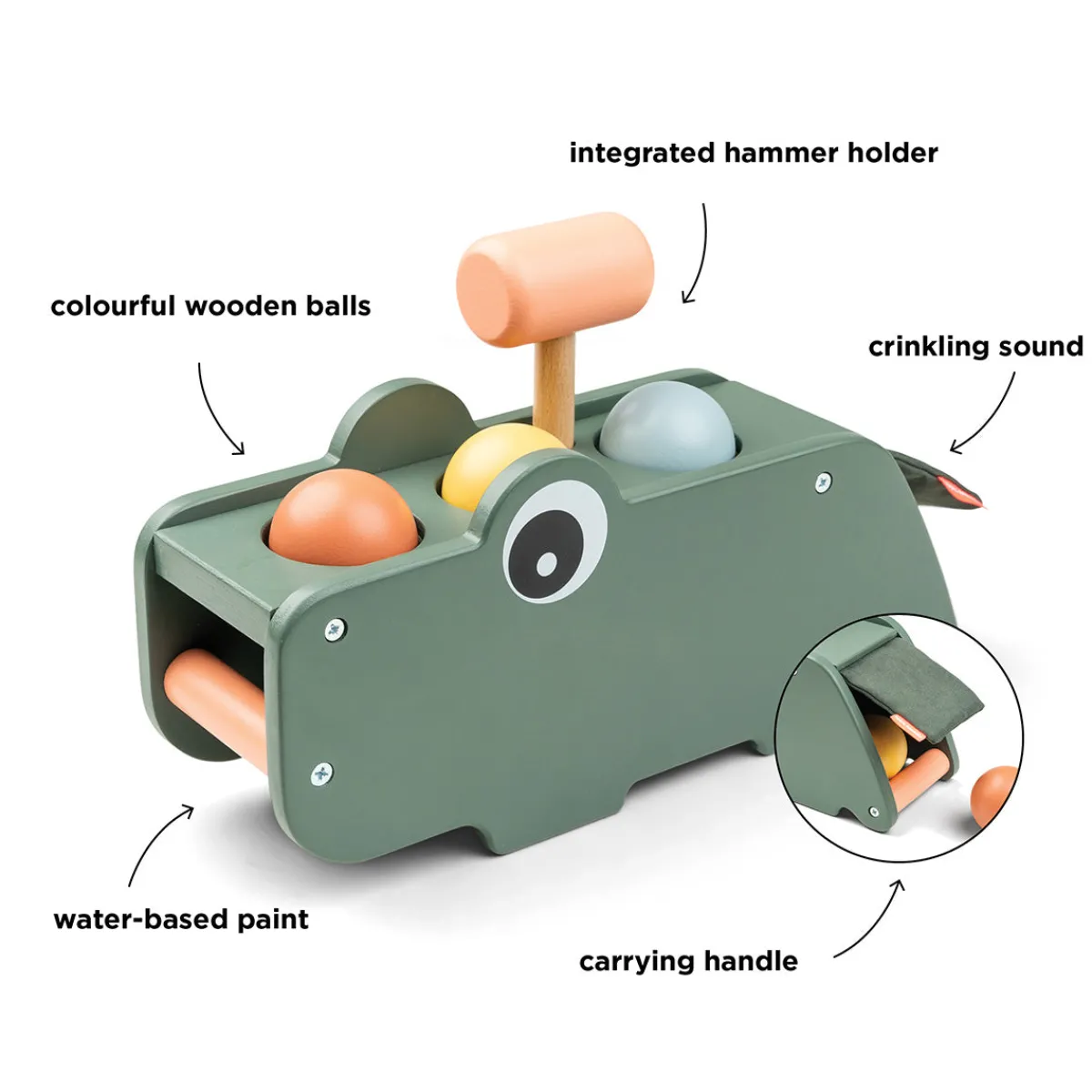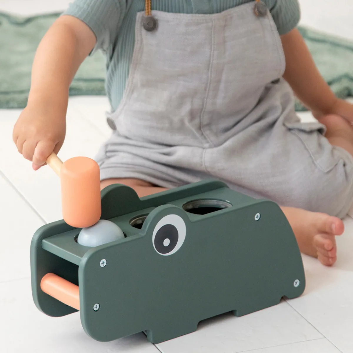 Hammerbrættet i træ fra Croco er en klassiker til det lille barn. Dets funktioner stimulerer hånd-øje-koordinationen og høresansen, når barnet slår på kuglerne med hammeren. Kuglerne er også perfekte til giv-og-tag-lege.