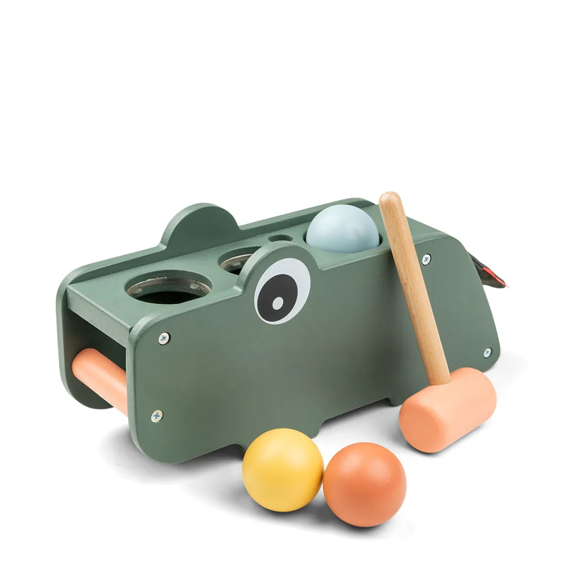 Krokodille Hammerbrættet er designet i grøn med farverige elementer. Trælegetøjet er lavet af ansvarligt indkøbt træ og malet med vandbaseret maling, der er fri for skadelige stoffer – hvilket gør det sikkert for dit barn at bruge.
