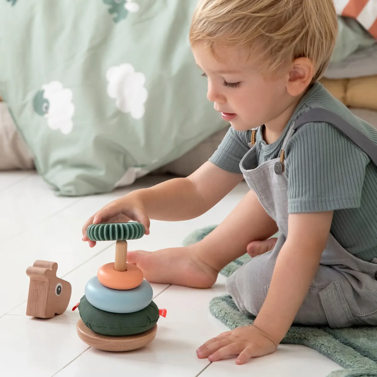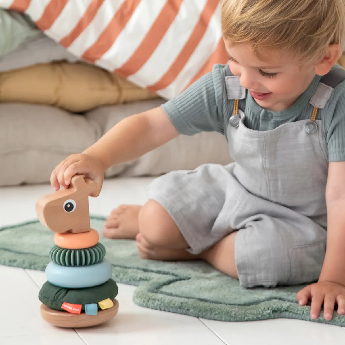 Ringene er lavet i forskellige størrelser – nogle af dem med små mærker, tekstil og riller. Stableren har også en vippefunktion og en kort hale, der kan trækkes i – begge dele er designet til at stimulere dit barns sanser gennem leg.
