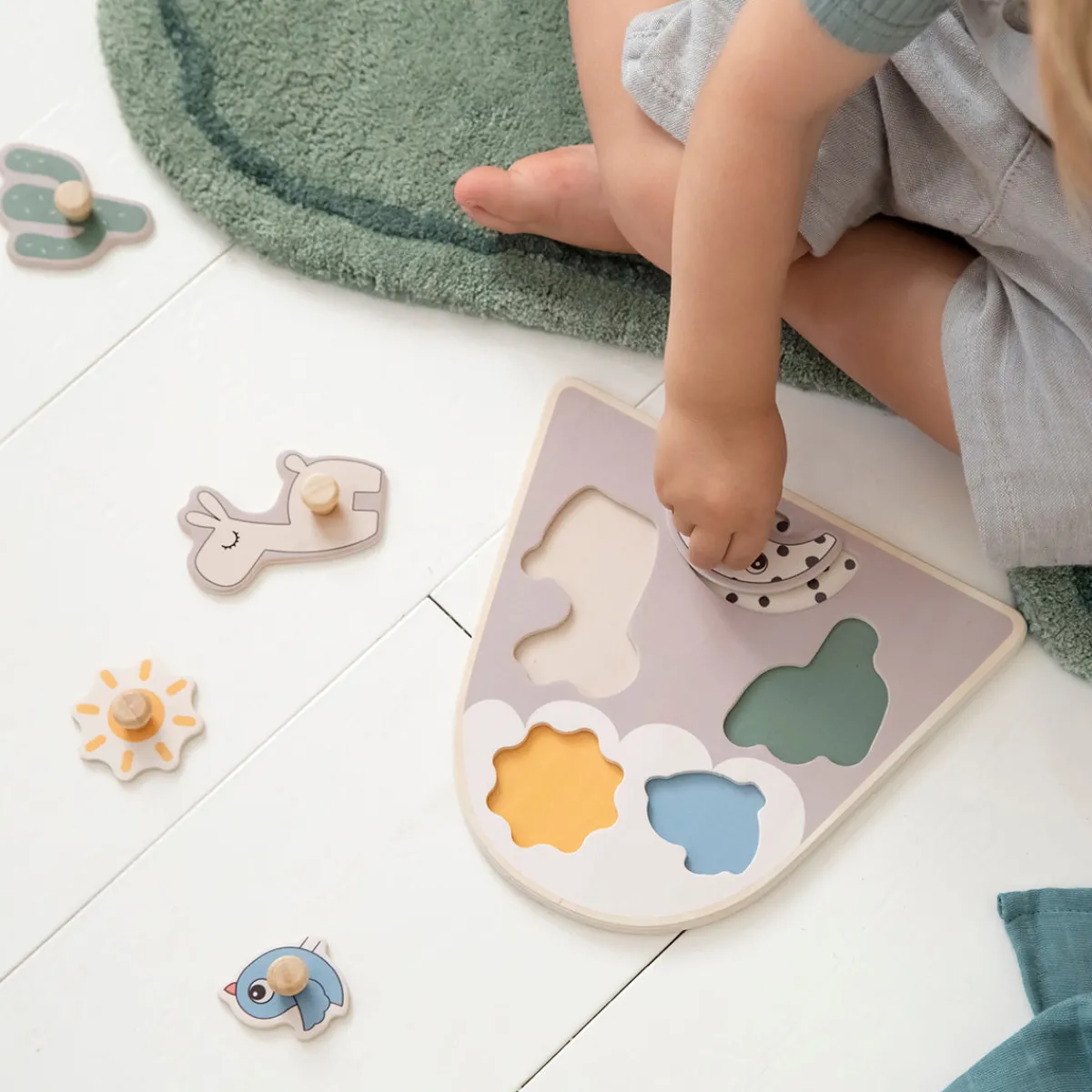 Små fingre kan gribe om de grove brikker og hjælpe Lalee, Birdee og Antee tilbage på plads og solen på toppen af bjerget. Åh, kaktussen mangler! Den skal placeres ved foden af bjerget – nu er alle brikkerne på deres rette plads.
