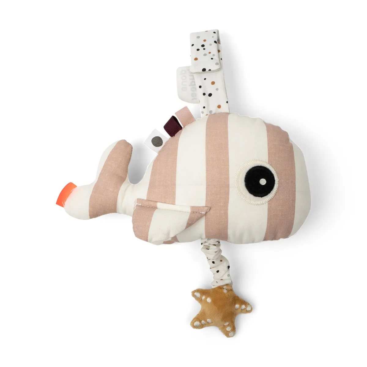 Den søvnige hval med bløde pudderstriber har søde detaljer som kontrastfarvede prikker og en blød søstjerne. Den vil berolige dit barn, når det er tid til at slappe af eller tage af sted til drømmeland.