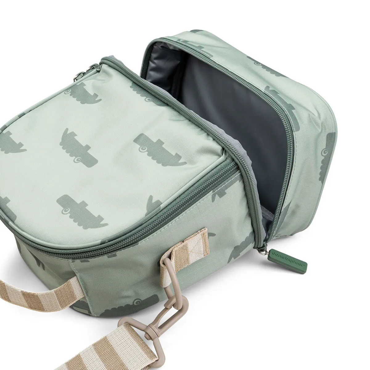 Den isolerede taske er designet i en flot grøn farve med et all-over print af Croco, krokodillen. Håndtag og skulderrem har Done by Deers signaturstriber i sand. Det slidstærke og vejrbestandige stof er nemt at rengøre med en fugtig klud.