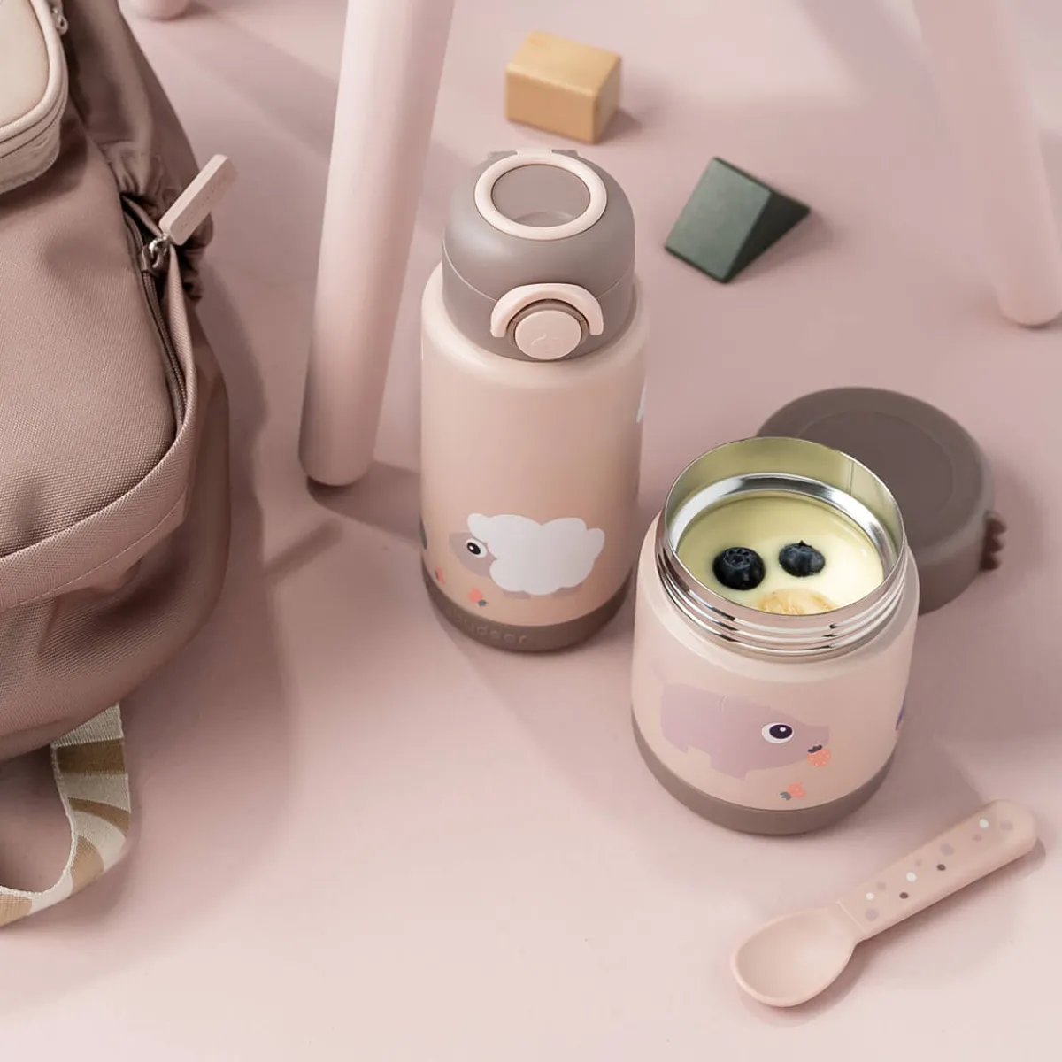Flasken er i en blød pudderfarve og bliver ekstra sød af den kække Pigee og den hyggelige Sheepy, som bringer fnis og hyggeligt selskab til hver drikkepause.