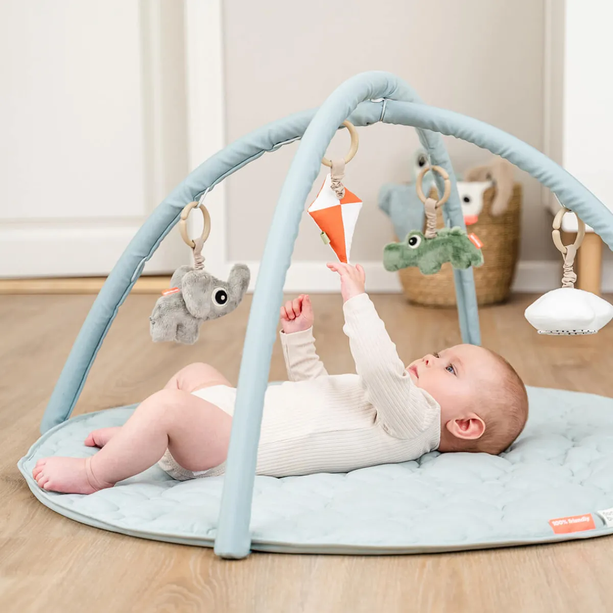 This lovely play mat with arches is a sensory wonderland for your little one. Featuring a rattle, bell, crinkle, and mirror, it’s designed to stimulate your baby’s hearing and tactile senses while encouraging exploration.