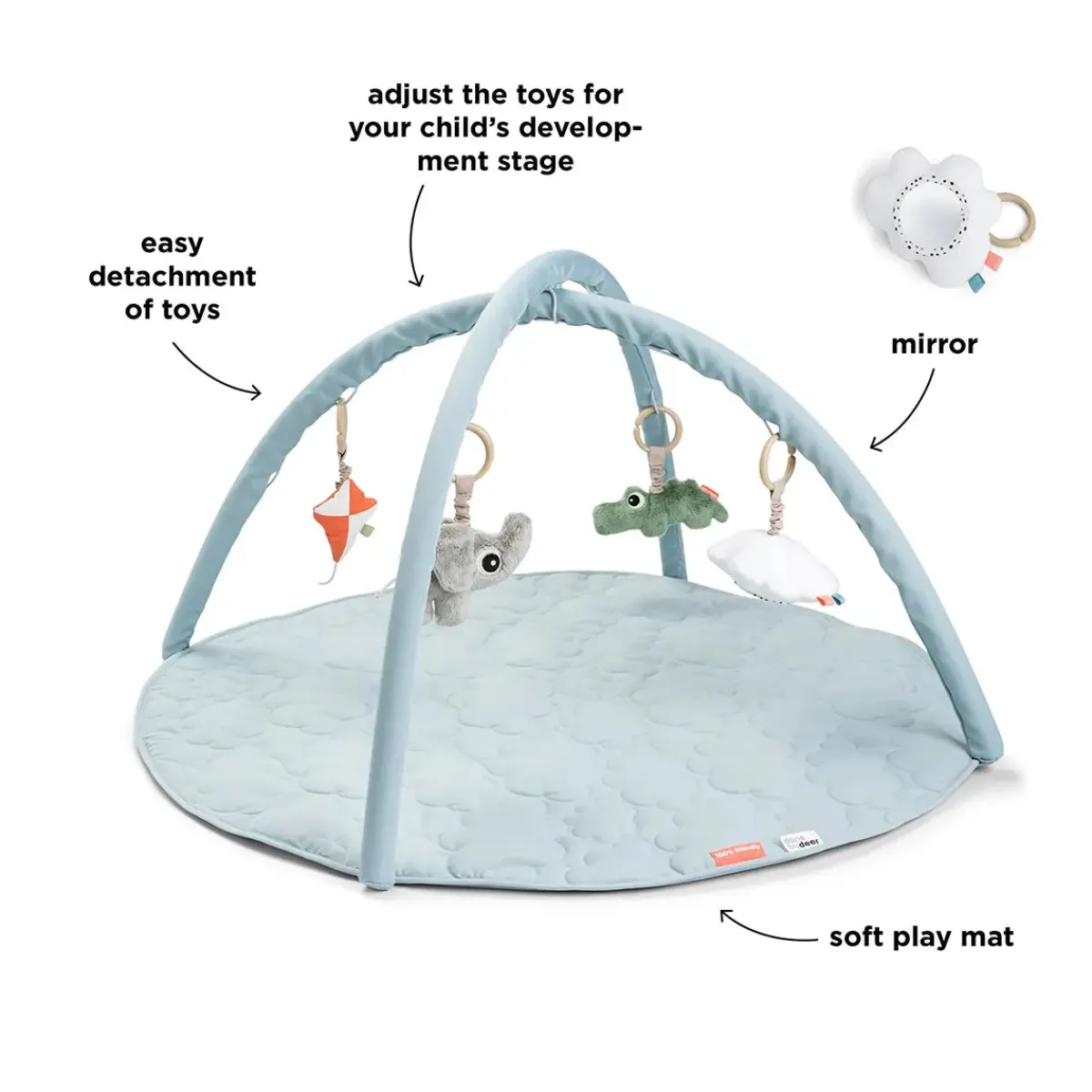 The four hanging toys can be adjusted to match your baby’s developmental stage or detached for independent play, perfect for little fingers to discover. The soft quilted mat, adorned with a cute cloud pattern and thick wadding, ensures a cosy and comfortable space for playtime.