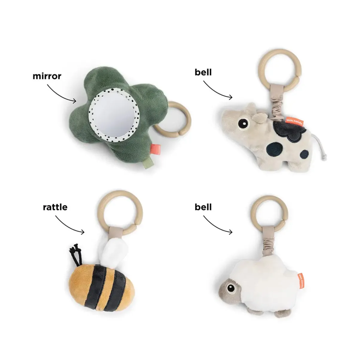 • Tilpas de fire hængende stykker legetøj til dit barns udviklingstrin