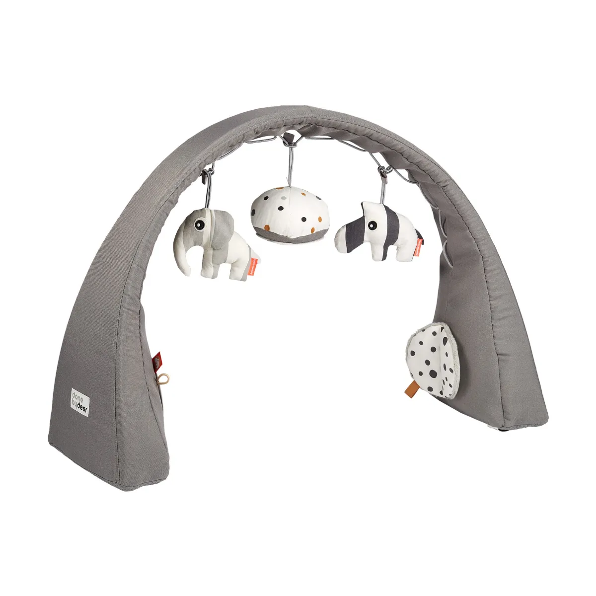 Indeholder 5 aktiviteter: rangler, spejle, knitre-lyde, former og teksturer. De 3 stykker legetøj kan flyttes mellem 17 punkter på buen. Vinder af Red Dot Design Award 2016.