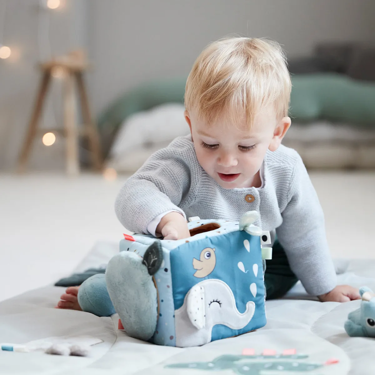Blade, der knitre, et blødt babyspejl og Croco, der gemmer sig bag døren, er bare nogle af de seje funktioner i denne kube. Gem dine egne skatte inde i kuben, eller brug de tre medfølgende rangler i søde farver, som kan klemmes.