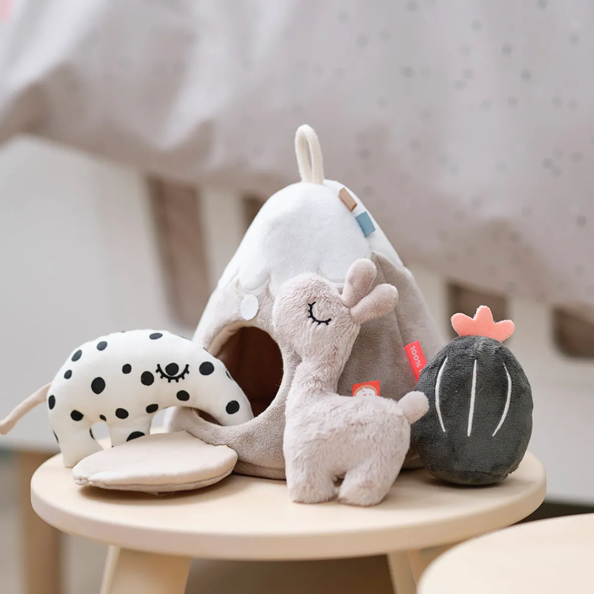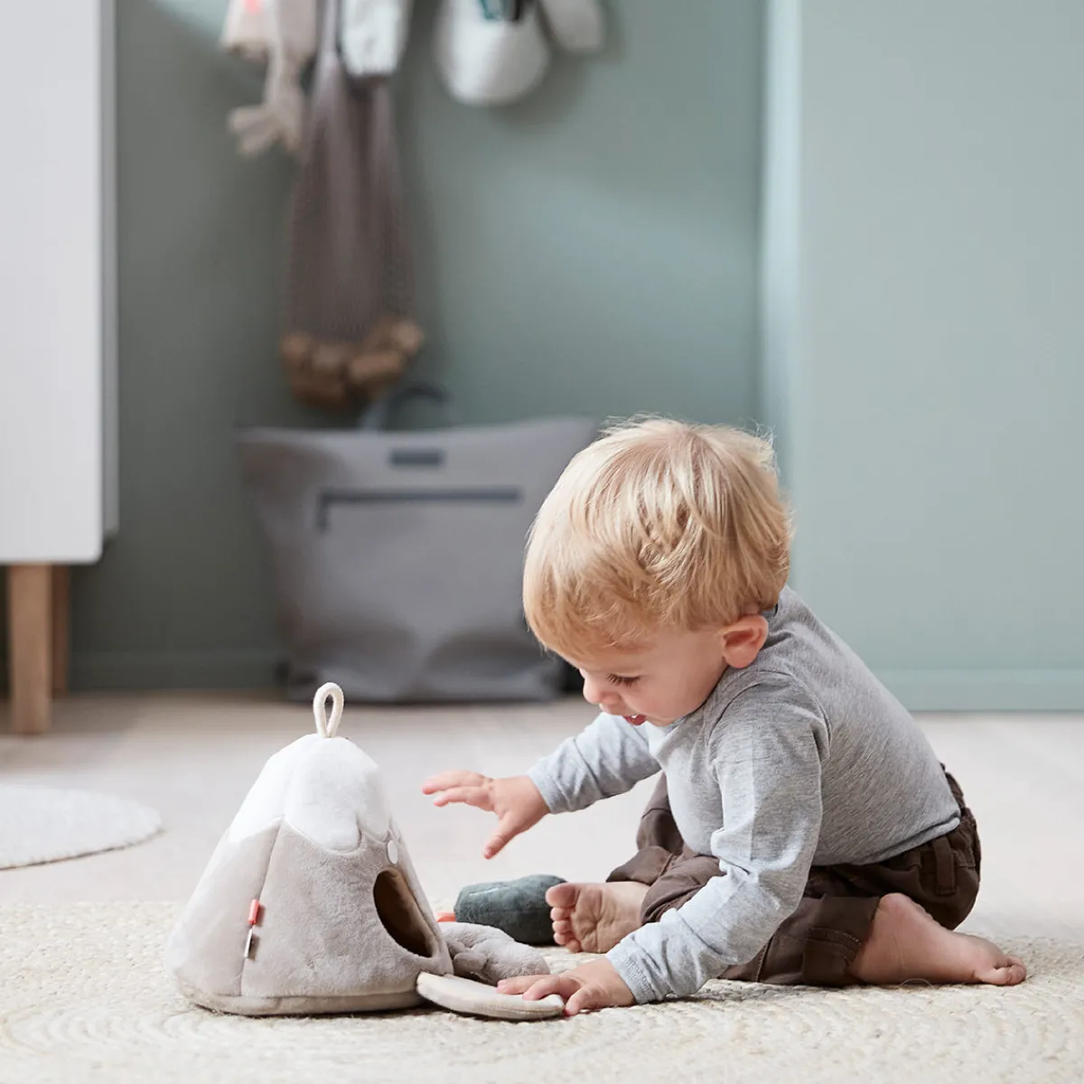 Hide & Seek-bjerget og det lille aktivitetslegetøj er i bløde nuancer af sand, blå, grøn og et stænk af koralrød.