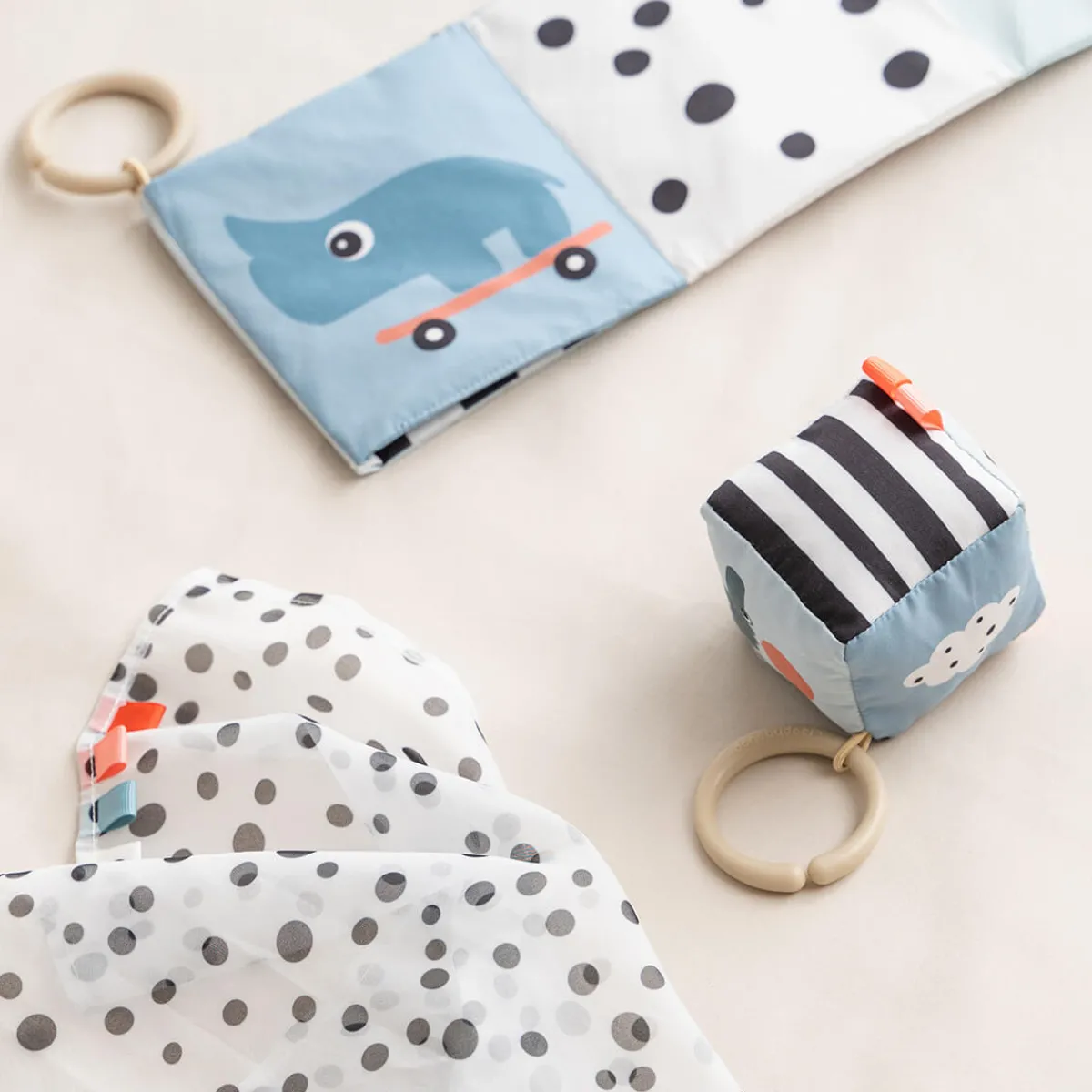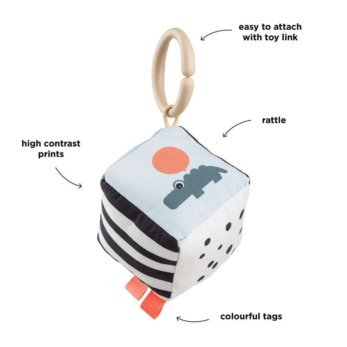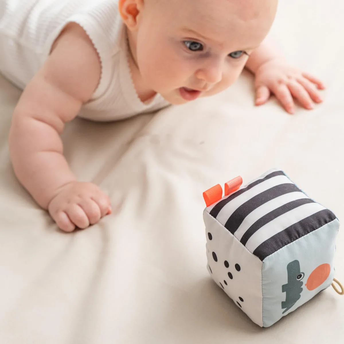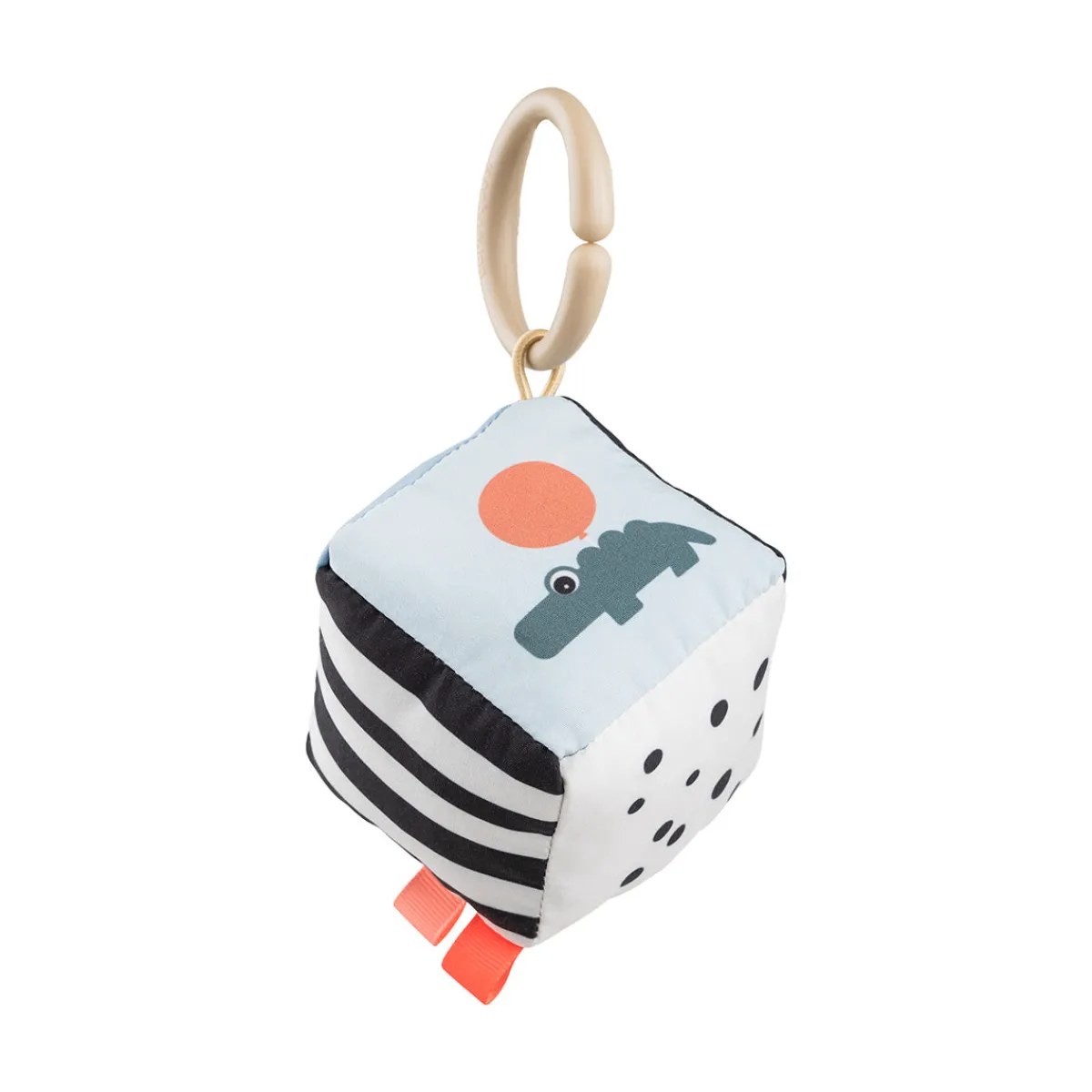 Terningen kan nemt sættes fast på barnevogne og aktivitetsbuer med den medfølgende Ophængsring, og den er ikke kun underholdende, men fremmer også den motoriske udvikling. Rul terningen for at motivere dit barn til at kravle og fremme både leg og bevægelse. Løft dit barns sanser med denne spændende terning.
