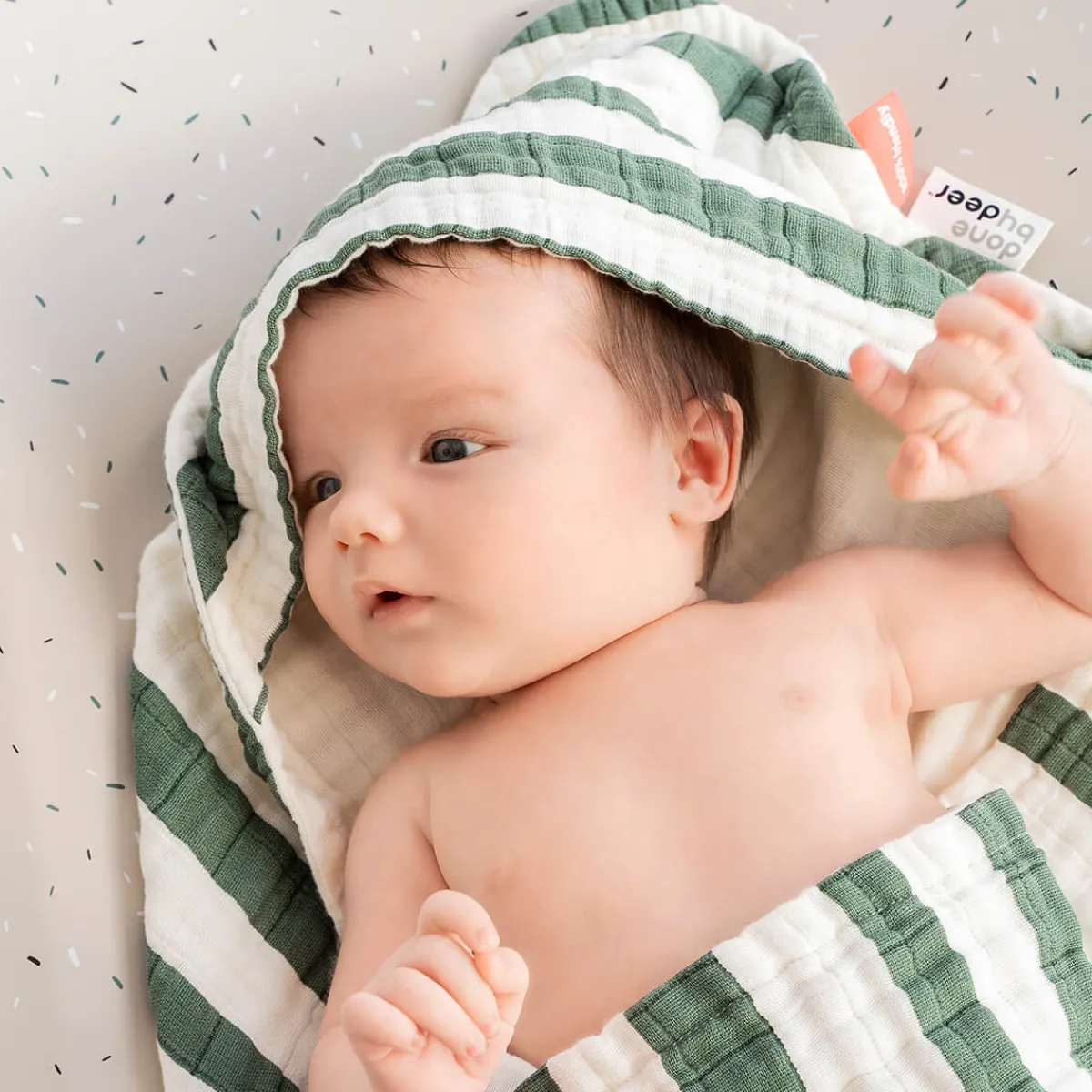 Hættehåndklædet med brede striber er perfekt til at pakke de små ind i og tørre dem efter et dejligt bad. Det bløde håndklæde af økologisk bomuld i flere lag er let, glat mod huden og tørrer hurtigt på en tur til stranden.