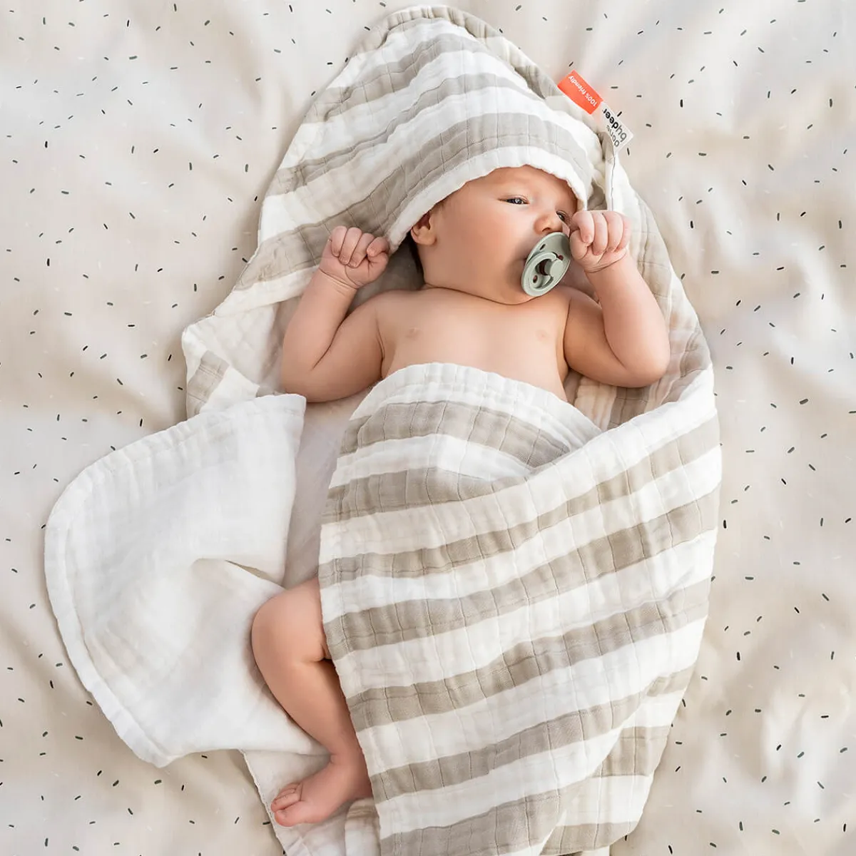 Hættehåndklædet med brede striber er perfekt til at pakke de små ind i og tørre dem efter et dejligt bad. Det bløde håndklæde af økologisk bomuld i flere lag er let, glat mod huden og tørrer hurtigt på en tur til stranden.