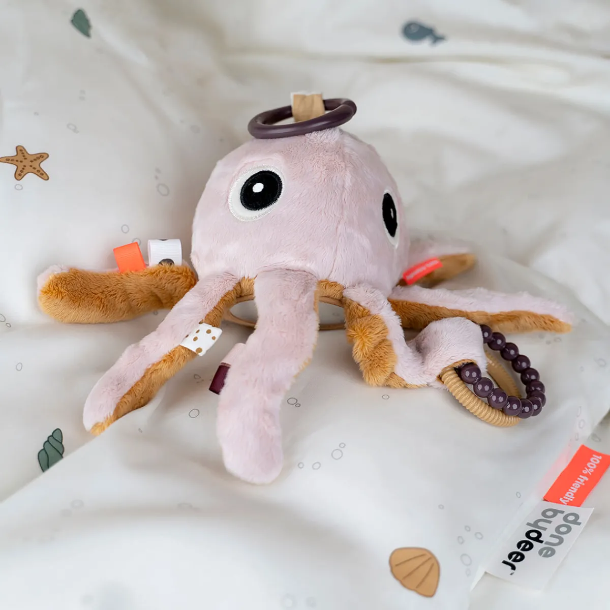 Med toylink kan du fastgøre de søde gopler til f.eks. barnevogn, klapvogn, autostol eller kravlegård – altid inden for rækkevidde for dit barn. Activity Jelly er i en blød pudderfarve med kontrastfarvet sennep på indersiden af armene.
