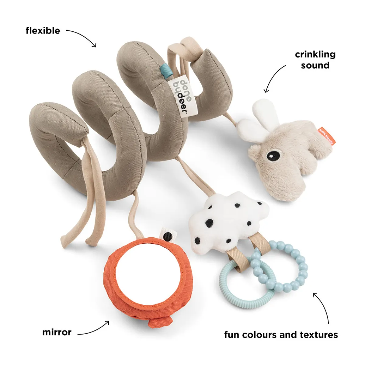 Aktivitetsspiralen Happy Clouds er den perfekte underholder, når du er på farten, og den er fuld af sanseindtryk, som dit barn kan udforske. Babylegetøjet kan fastgøres til tremmesengen, autostolen, klapvognen eller barnevognen ved hjælp af de bløde snore.