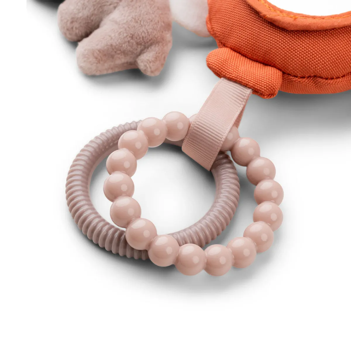 Aktivitetsspejlet har en ballonrangle, en blød tekstureret Ozzo og sky, to teksturerede ringe og sjove tags. Barnet kan nemt gribe fat i ringene og holde aktivitetsspejlet. Brug Ophængsringen til at fastgøre det til barnevognen, autostolen eller mavepuden.