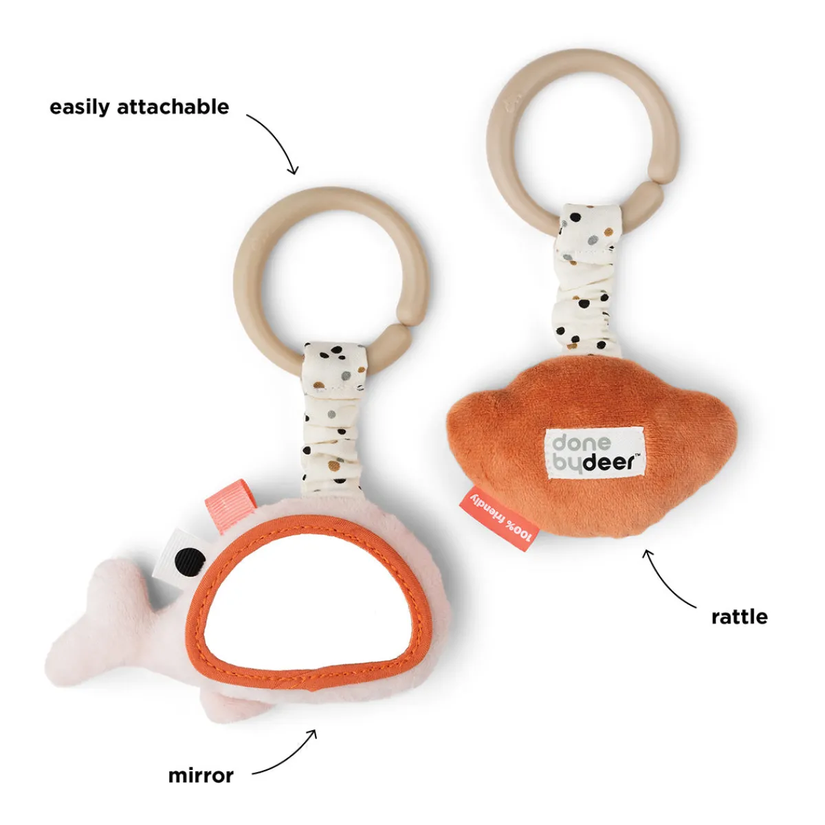 Den bløde Wally har et sjovt babyspejl, og den cool søstjerne har en sansestimulerende knitrelyd. Begge er udstyrede med små mærker, der er sjove at undersøge, og de er nemme at hænge op ved hjælp af den praktiske legetøjsring.