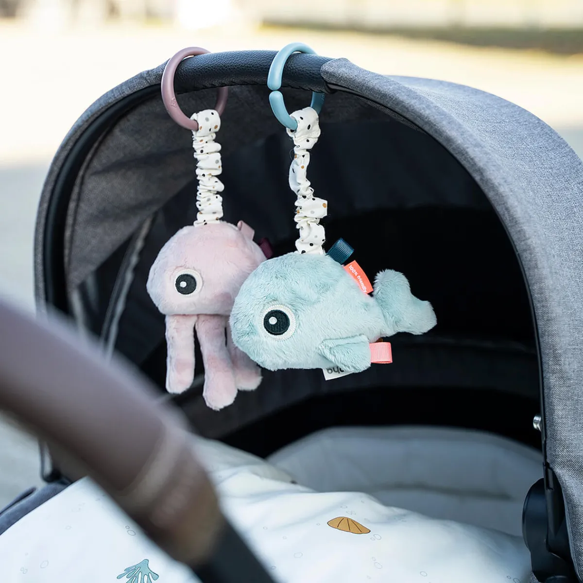 Små hænder kan nemt holde om Jelly, og legetøjsleddet gør det nemt at fastgøre Jelly til f.eks. barnevognen eller kravlegården.
