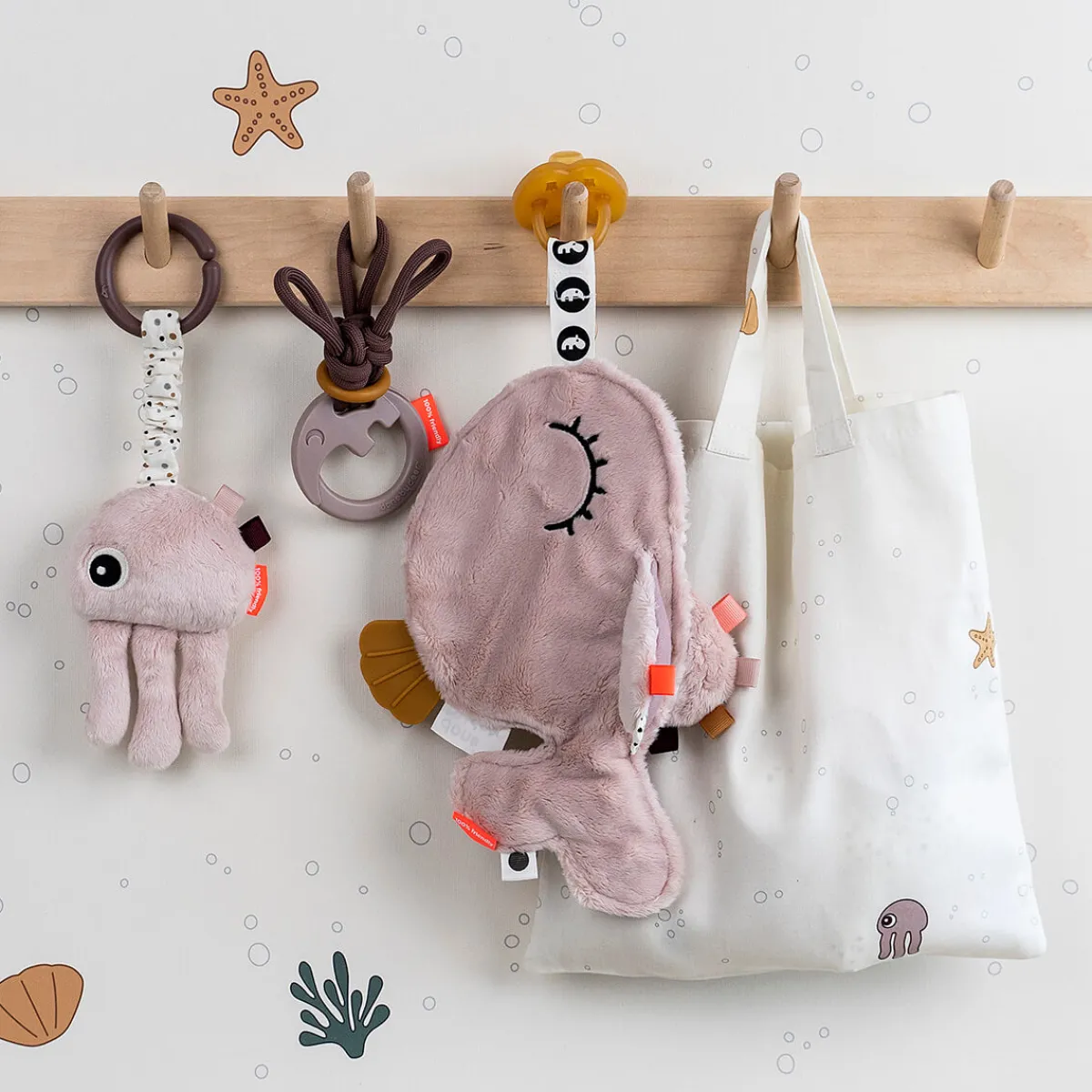 Den superbløde Sea friend er pudderfarvet med detaljer i form af gyldne prikker og farverige tags.