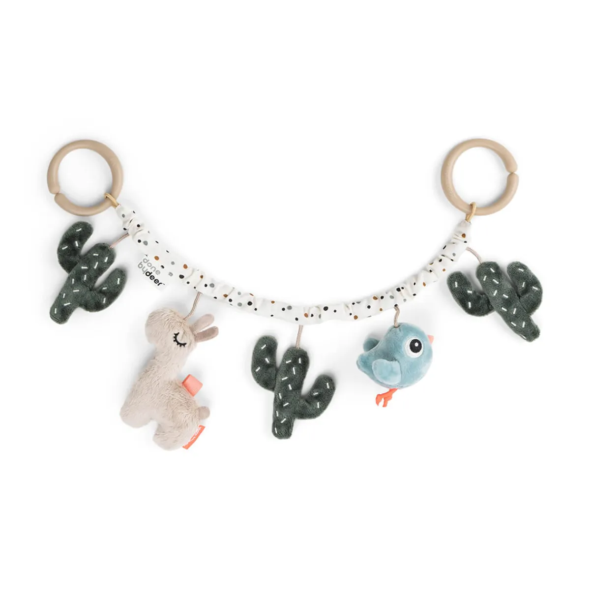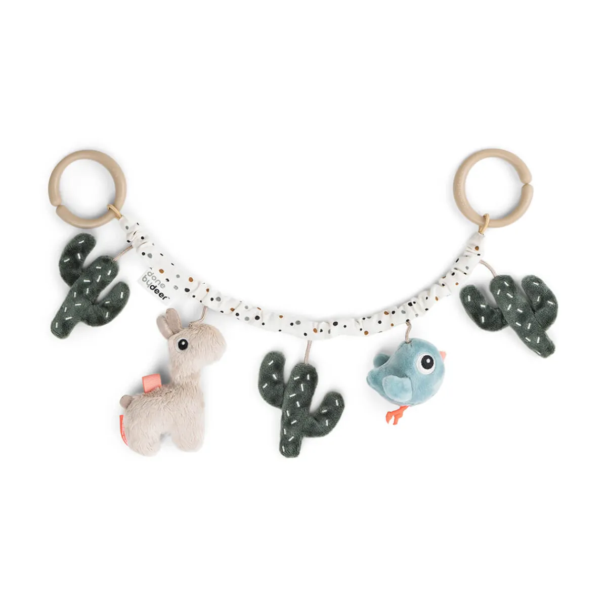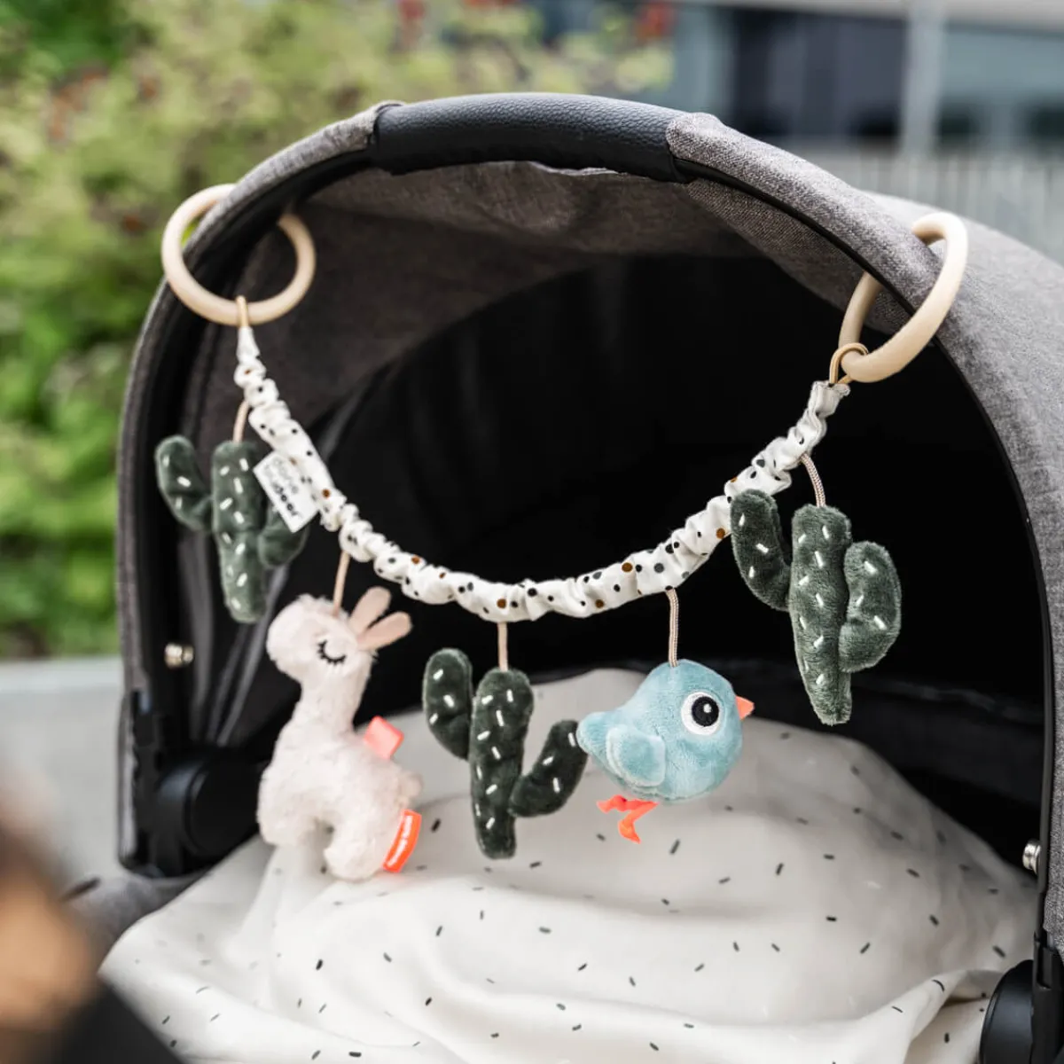 Det elastiske Barnevognskæde er fleksibelt og kan nemt fastgøres med Ophængsringe til en barnevogn, klapvogn eller en autostolskaleche.