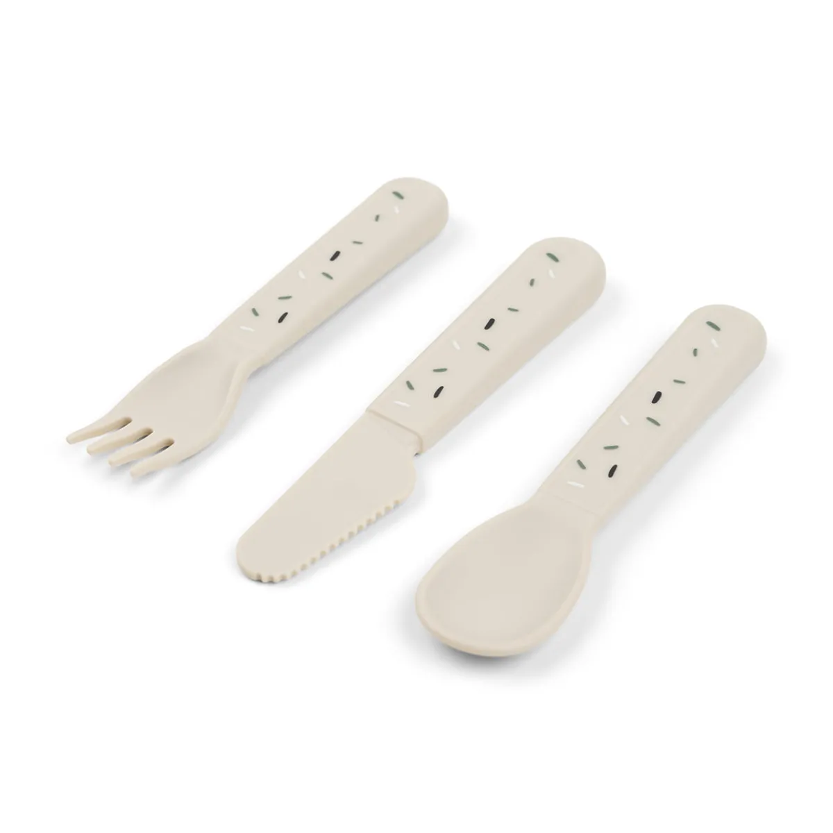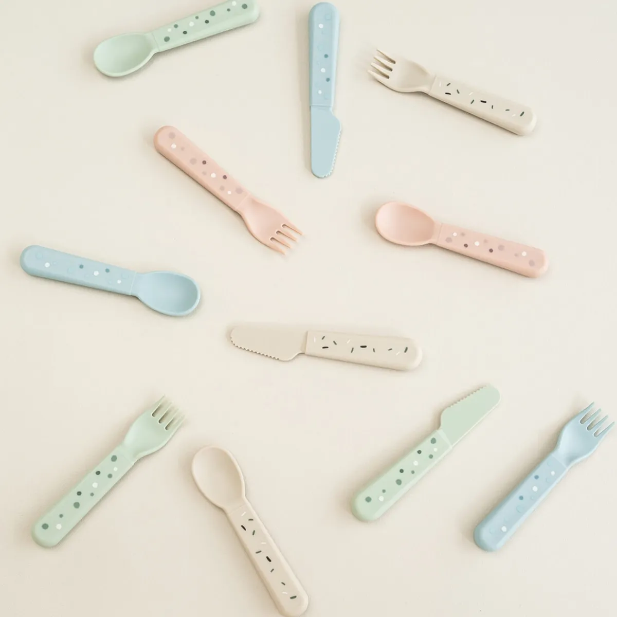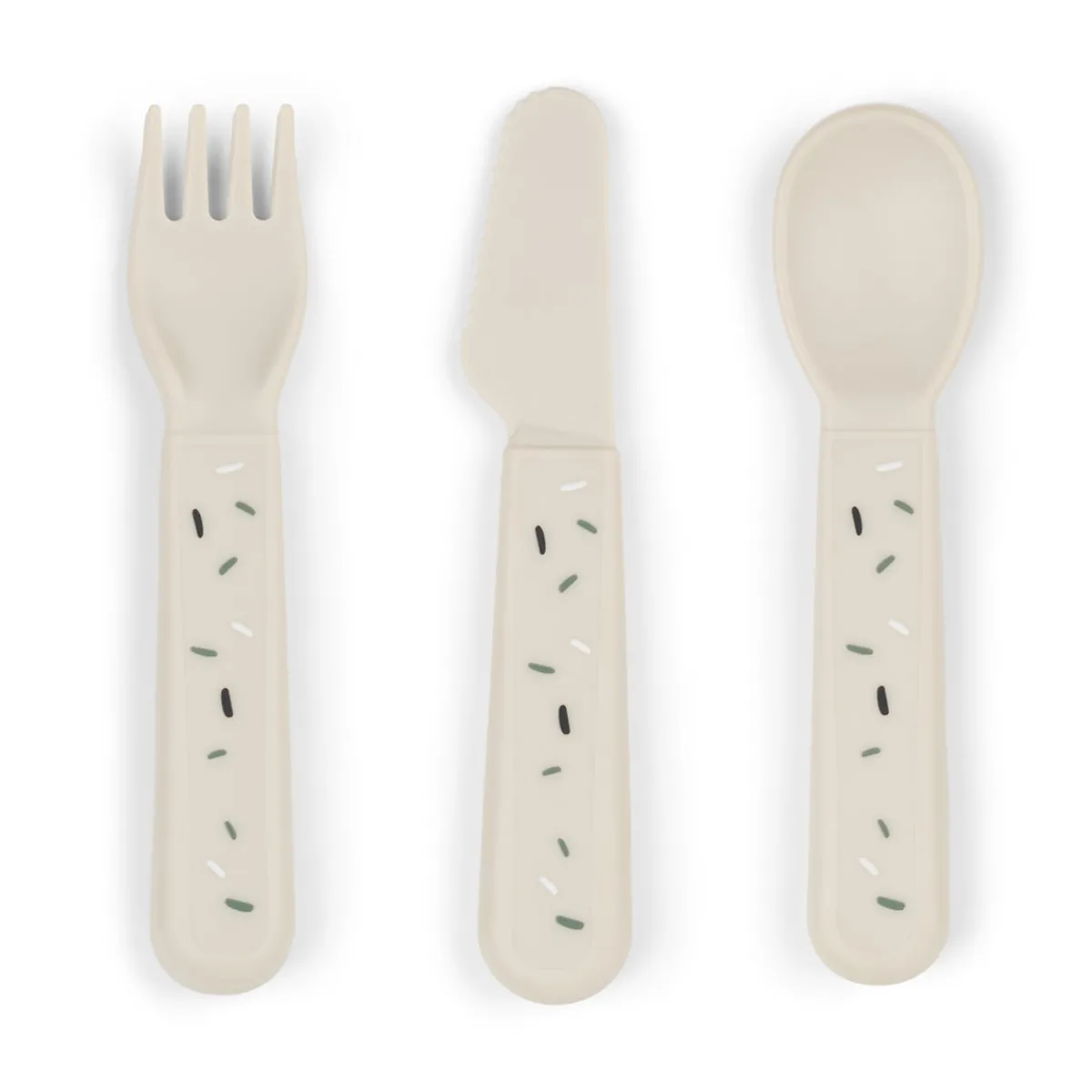 Det søde bestik til babyer og småbørn består af en ske, en gaffel og en kniv. Når bestikket har tjent sit formål gennem utallige familiemiddage, kan det sorteres som plast og genbruges til nye hverdagsprodukter.
