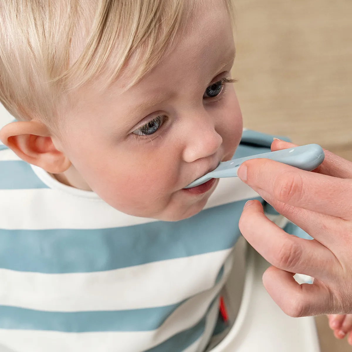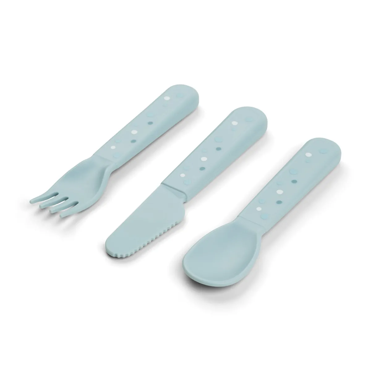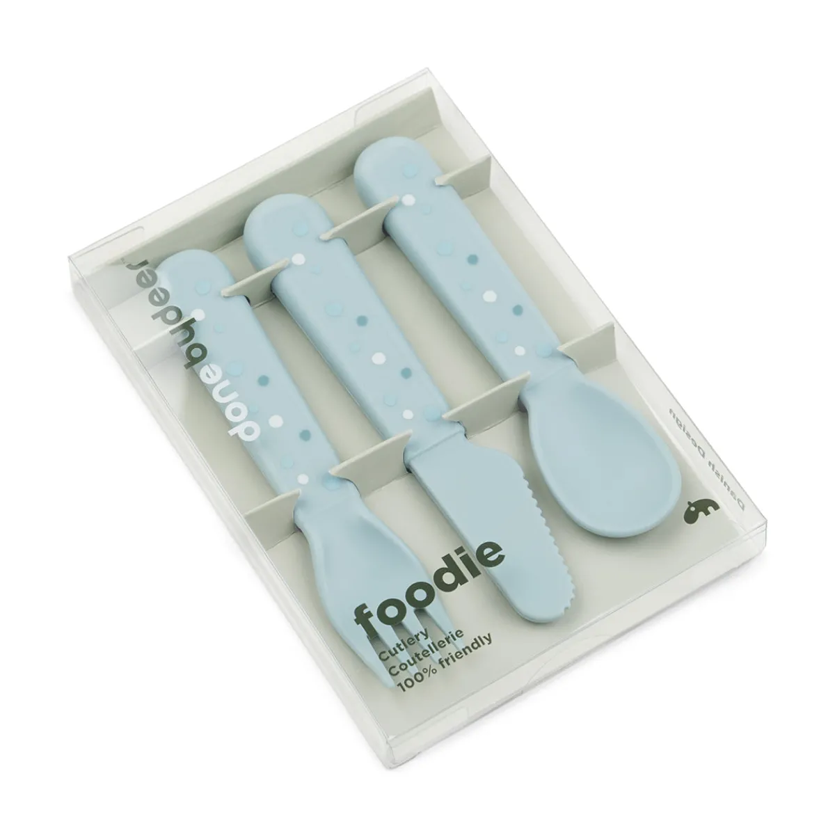 Dette blå Foodie-bestiksæt har bløde, afrundede kanter, der gør bestikket sikkert for småbørn, der øver sig i at spise selv. Bestikket passer perfekt i små hænder og er blevet grundigt testet af børn.