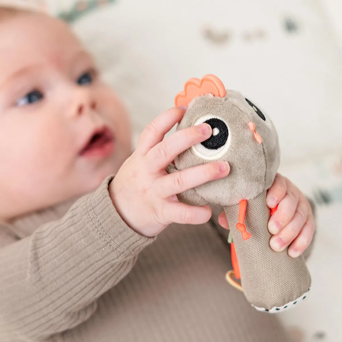 This sensory rattle is designed to engage your baby’s senses while providing soothing relief. With sensory elements like a rattle and a variety of textures, it stimulates your baby’s sense of hearing and touch. The rooster comb can be used as a teether, perfect for soothing itchy gums during teething.