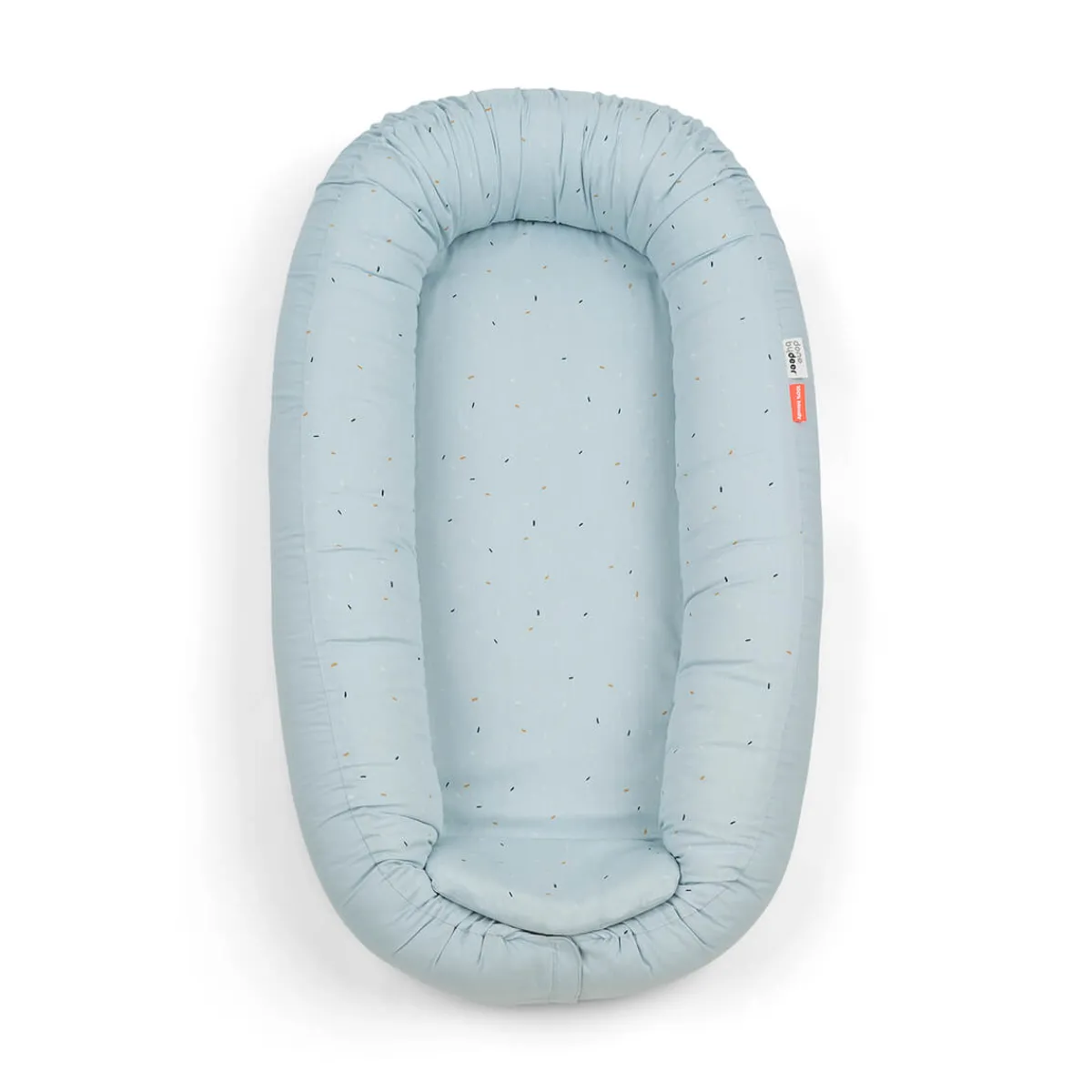 Den lyseblå cozy nest er drysset med festlig confetti på indersiden og har en ensfarvet blå farve på ydersiden. Babynesten er lavet af blødt bomuld med polyesterfyld og har en blød skummadras i ét stykke.