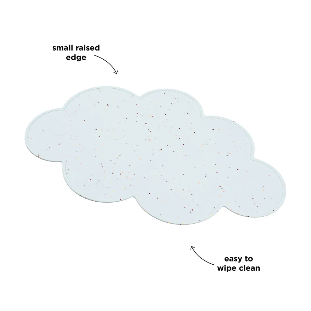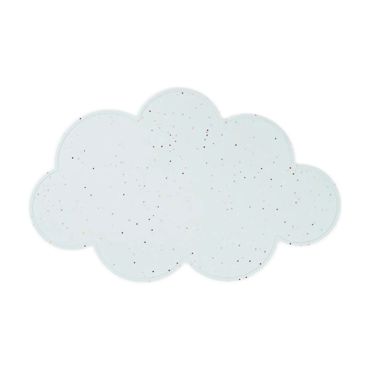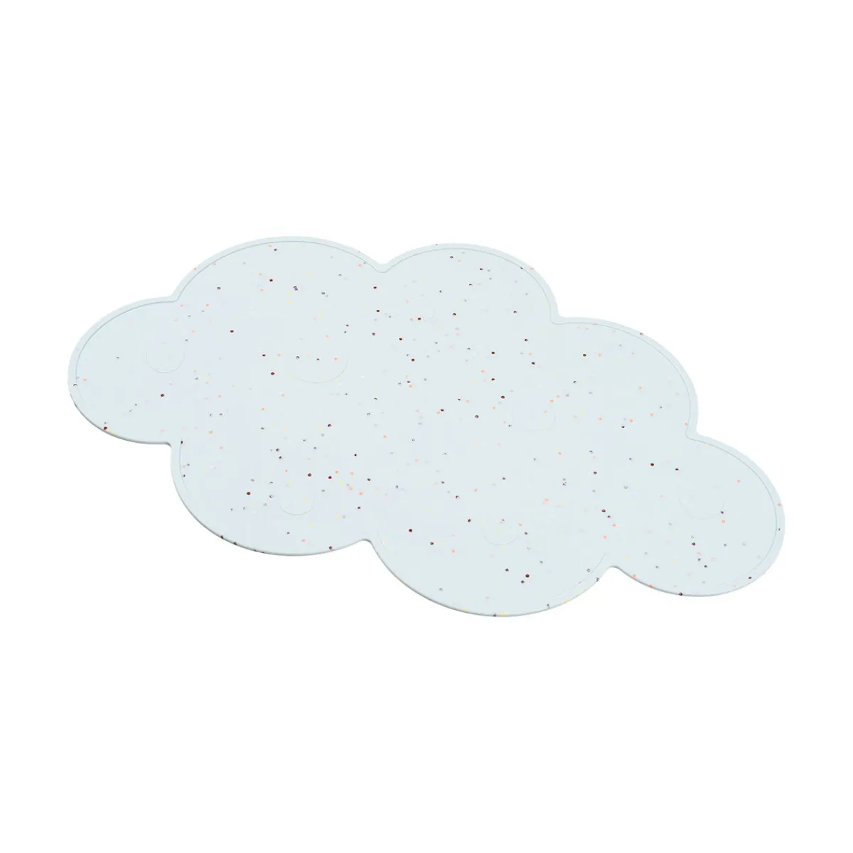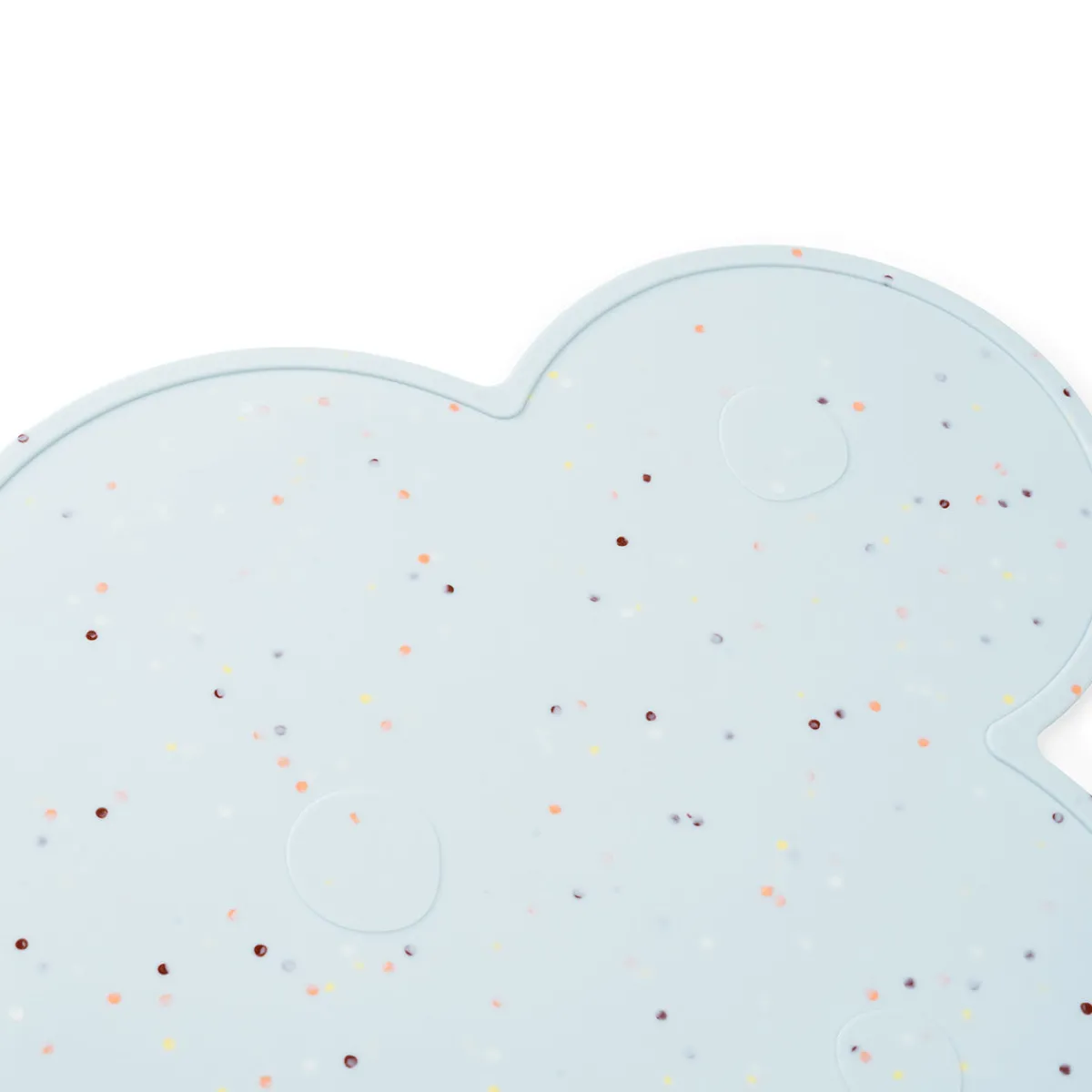 Praktisk skyformet dækkeserviet i en dejlig blå farve, drysset med sjov confetti. Dækkeservietten er fremstillet af 100 % fødevaregodkendt, BPA-fri silikone og giver børnene en sikker oplevelse. Den lille forhøjede kant stopper effektivt spildt væske, mens silikonens skridsikre egenskaber holder dækkeservietten sikkert på plads under barnets måltid.