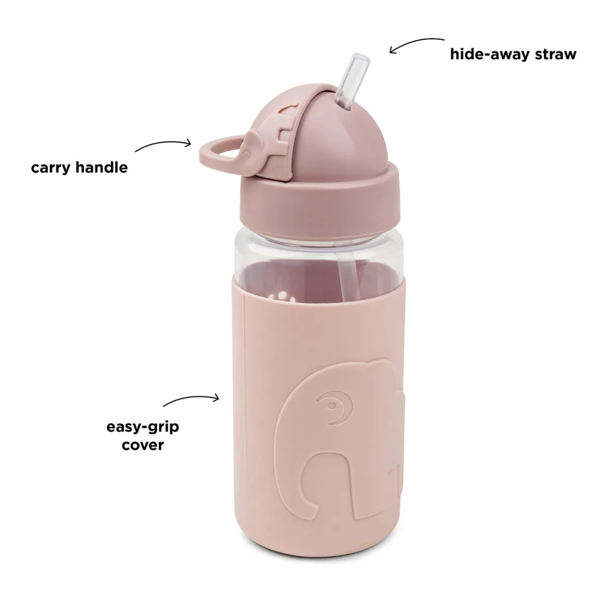 Den søde Drikkedunk med sugerør med easy-grip passer perfekt i børnenes rygsæk. Drikkedunken har et praktisk sugerør, der kan gemmes væk, og når det er gemt væk, forhindrer låget, at der spildes væske. Bærehåndtaget hjælper små fingre med at få adgang til sugerøret.