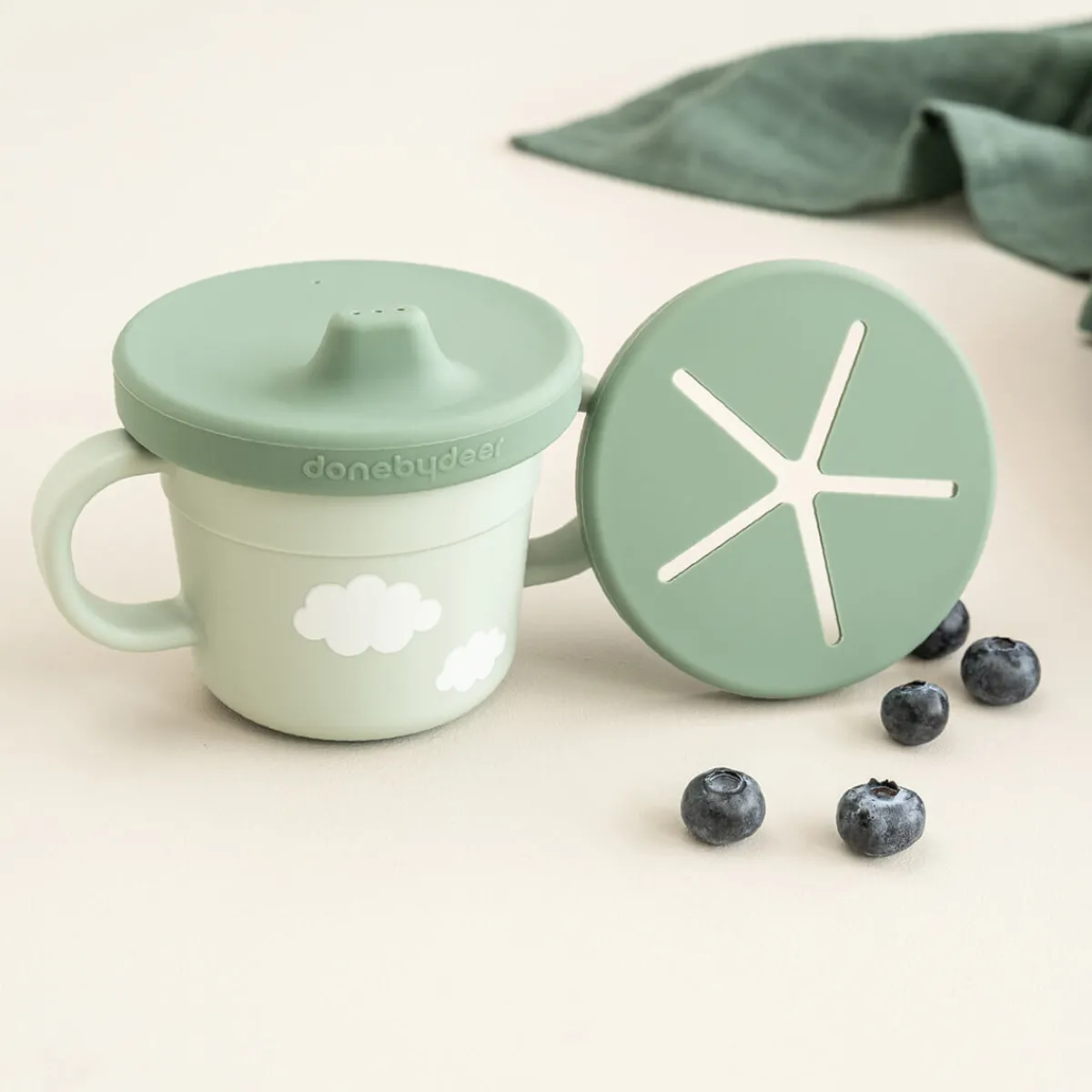 Den seje grønne tud- og snackkop er trykt med den hjertevarme krokodille, Croco, på den ene side og skyer på den anden. Tudelågets mørkere grønne farve giver en fin tofarvet detalje.