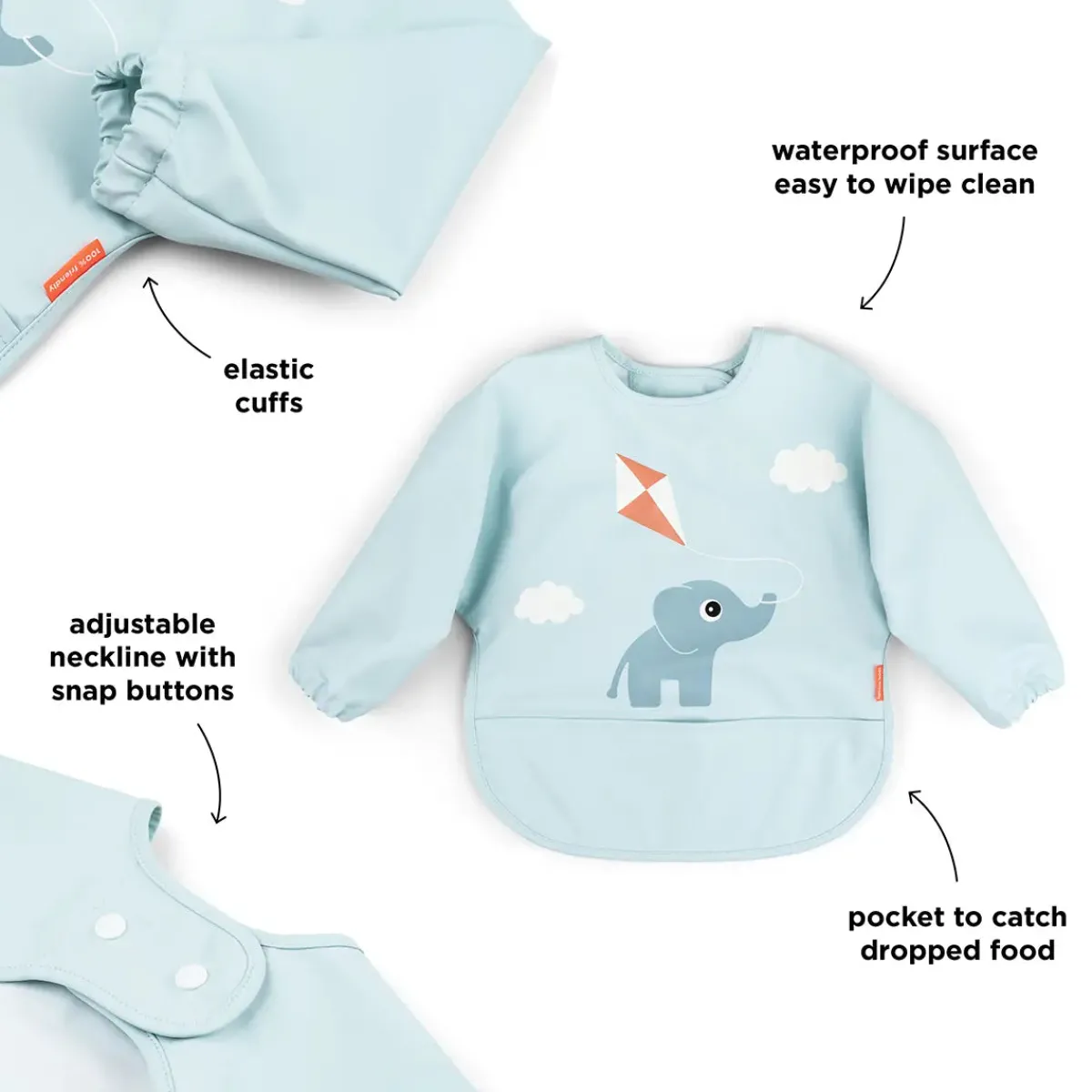 Denne skønne blå hagesmæk har et sødt motiv af Elphee, der flyver med en drage. Hagesmækken sikrer renlighed med sin vandtætte overflade, der beskytter tøjet mod spild og snavs. Tilføjelsen af beskyttende ærmer giver ekstra dækning og holder dit barns tøj sikkert.