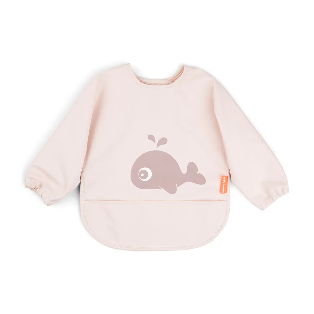 Hagesmækken m/ærmer og lomme er i en sød pudderfarve med et motiv, der viser Wally, den mægtige hval, der sprøjter med vand.