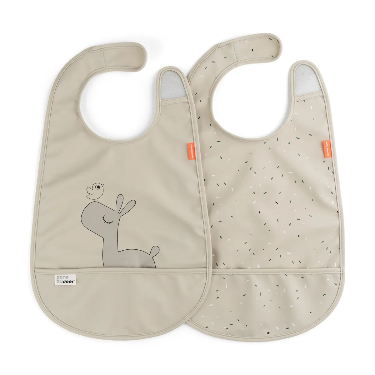 De søde hagesmække er i en blød sandfarve. Den ene er dekoreret med Lalee og Birdee, og den anden er dækket af Happy dots i bløde farver.