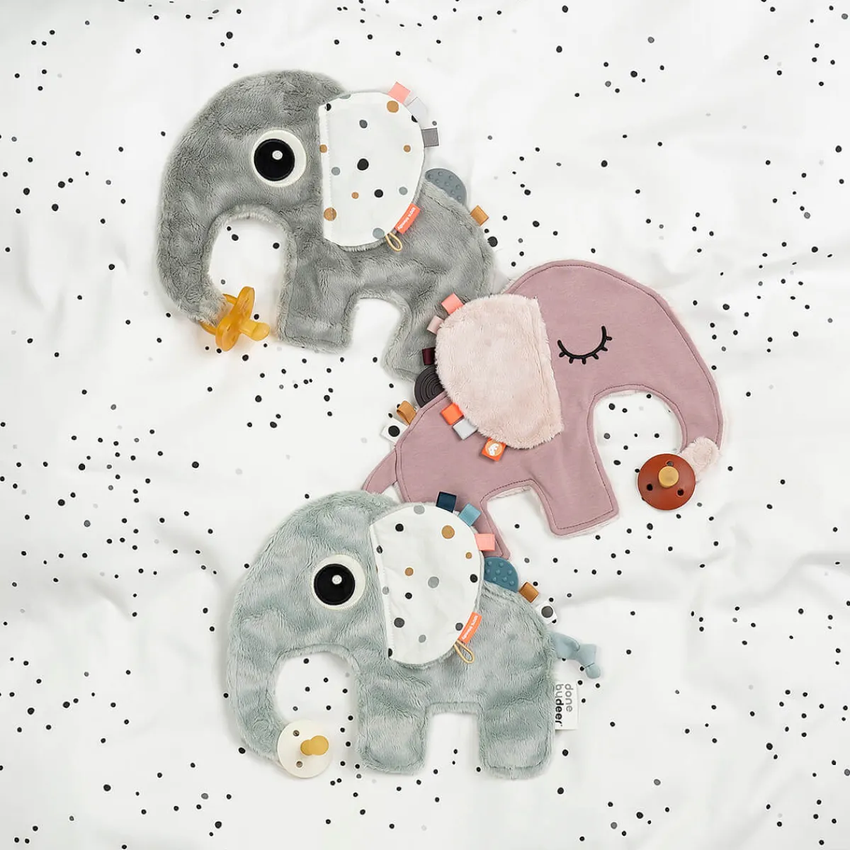 Den søde elefant holder sutterne i nærheden, når det er sengetid, eller når man er out & about. Den praktiske velcrolukning og den elastiske løkke gør det muligt at fastgøre både sutter med og uden håndtag.
