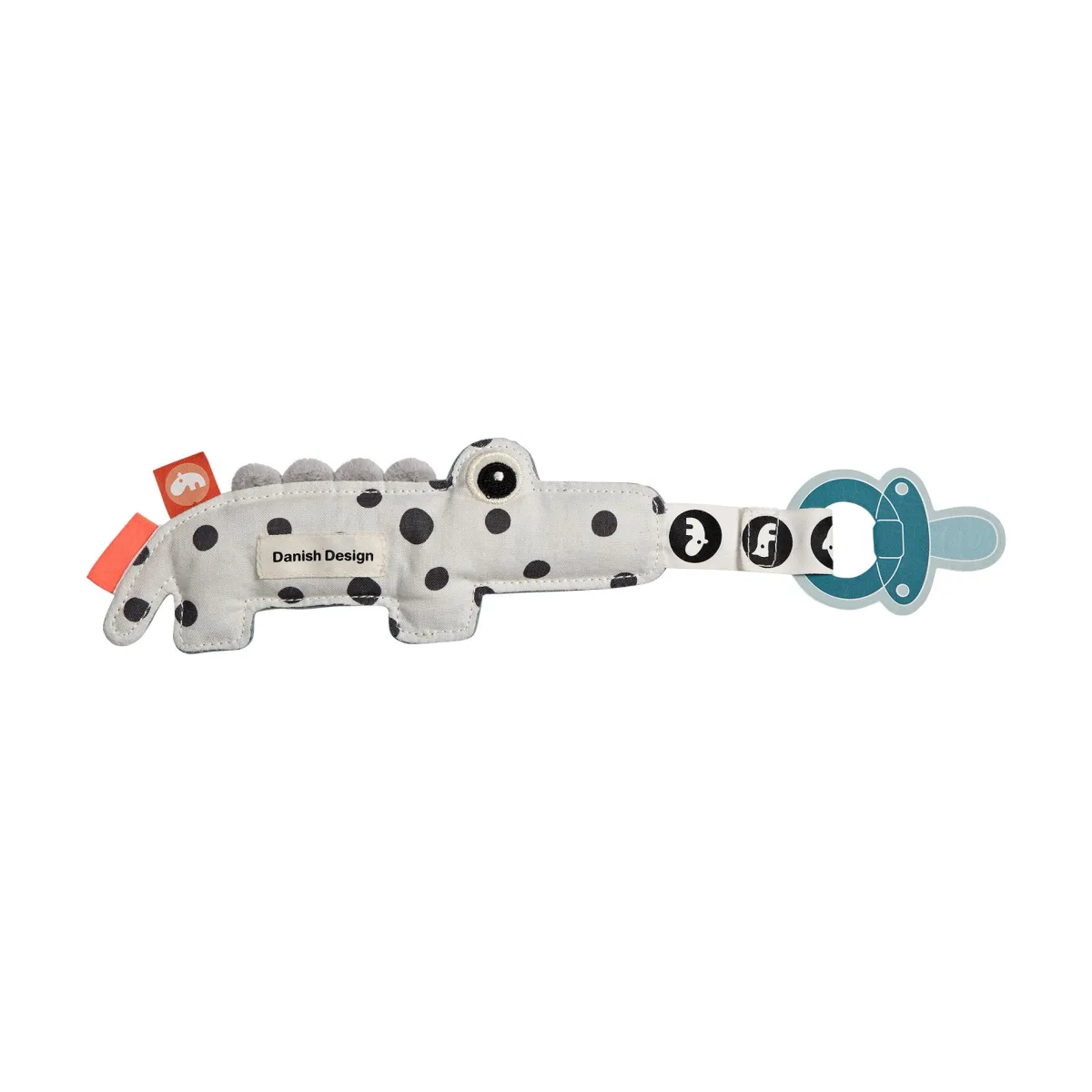 Sutteholder med velcrolukning og en elastisk løkke til både sutter med og uden håndtag.