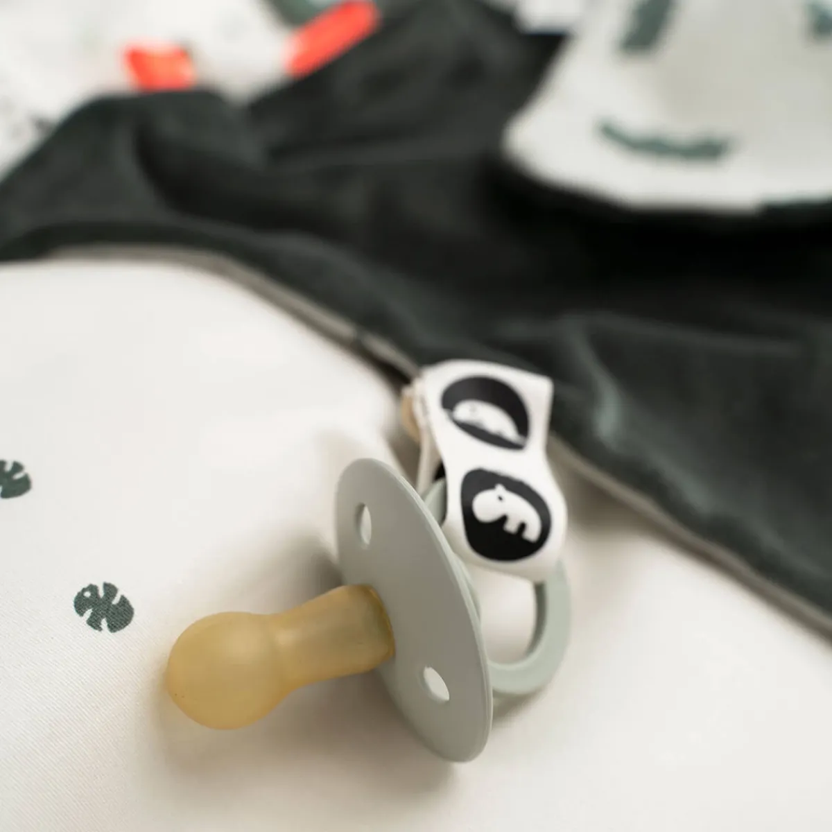 Den søde bidering i silikone med krokodilleskæl og forskellige strukturer, der stimulerer og beroliger kløende gummer, kan tages af og bruges alene. Der er en praktisk velcrolukning og en elastisk løkke til at fastgøre en sut, som man kan have lige ved hånden.