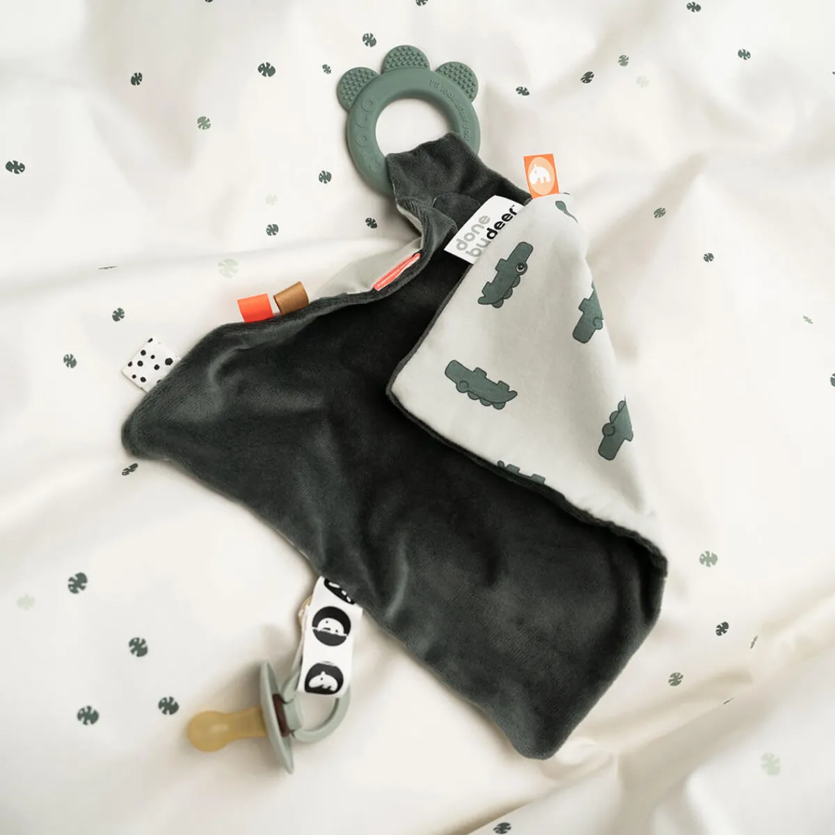 Et ægte baby-must-have i bløde grønne toner med et sødt croco-print og farverige mærker, der giver barnets sanser en oplevelse.