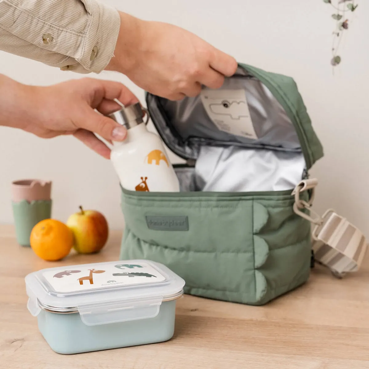 Den praktiske madkasse i rustfrit stål er i en blå tone. Låget er dekoreret med Deer friends Croco, Elphee, Raffi og Ozzo i bløde nuancer af grøn, blå, sennep og pudder.