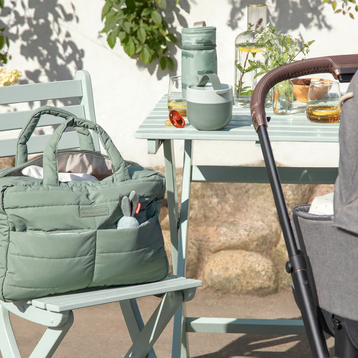 To go madbeholderen har et rent design i moderne farver. Et skruelåg holder godbidderne inde. Det aftagelige bærehåndtag i silikone gør det nemt for barnets hænder at bære skålen.