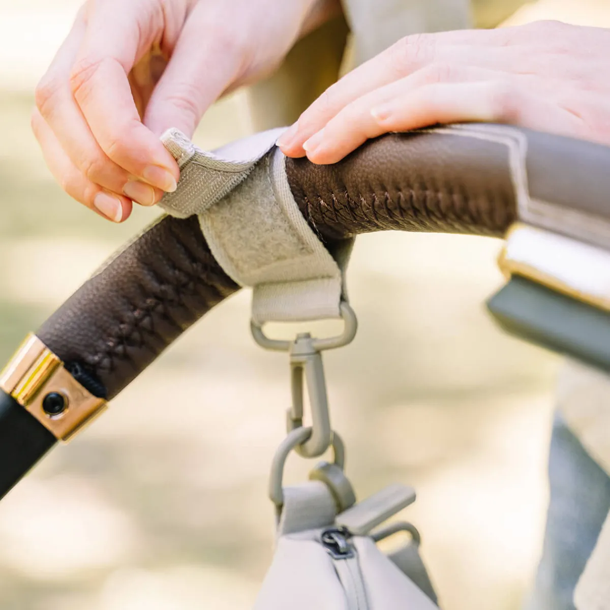 – Fastgør tasken til barnevognens håndtag ved hjælp af de medfølgende barnevognskroge