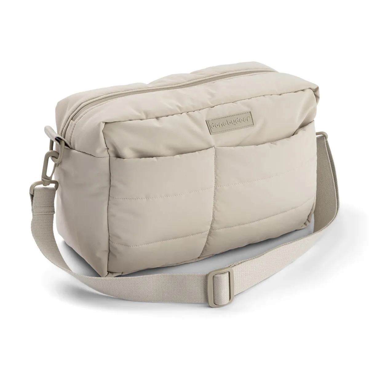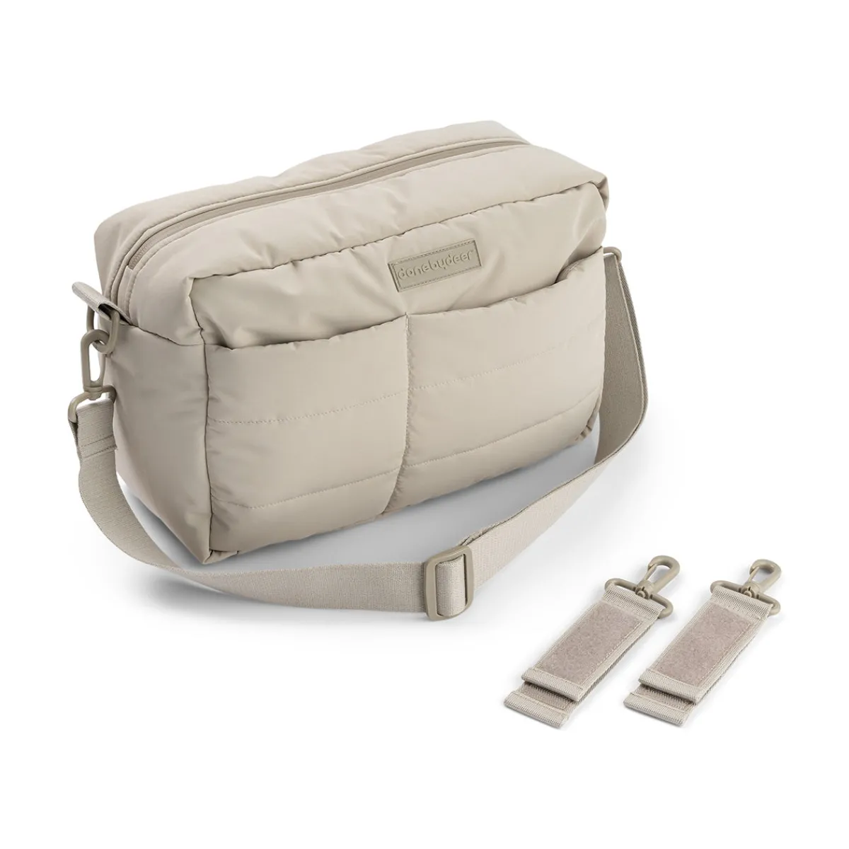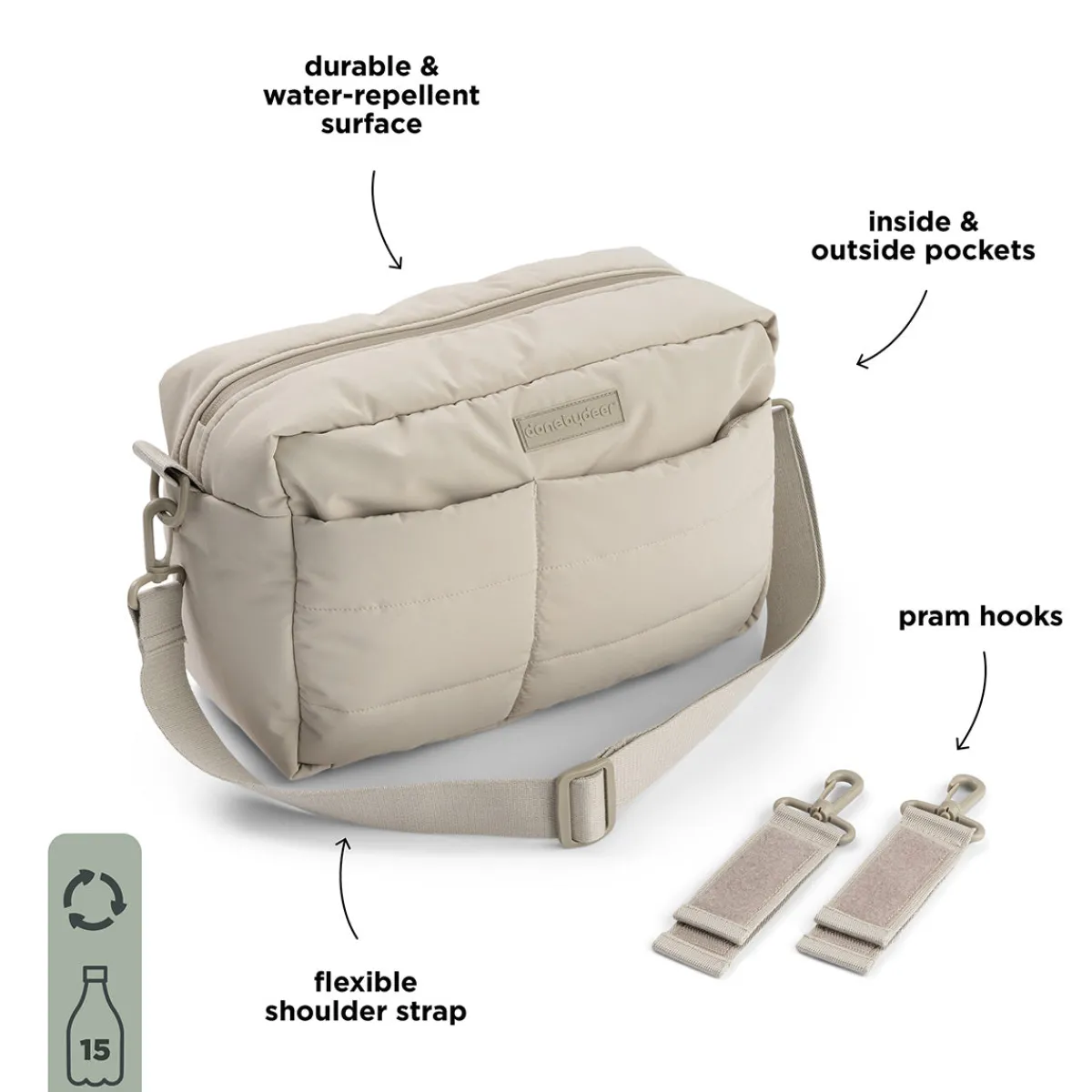 • A flexible shoulder strap and pram hooks are included