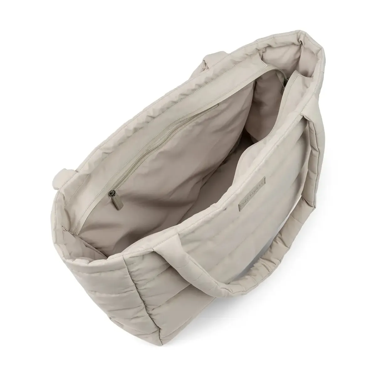 Denne bløde sandfarvede quiltede tote bag er perfekt til alle de ekstra ting, du og dit barn har brug for på farten. Med en sikker lynlåslukning forbliver dine ejendele i sikkerhed, mens den slidstærke, vandafvisende overflade sikrer, at den kan klare de daglige eventyr.