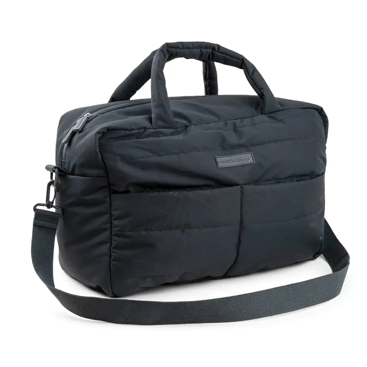 Den bløde quiltede pusletaske og puslemåtten er designet i en stilfuld sort farve. Stropperne på ydersiden gør det nemt at fastgøre tasken til barnevognen. Overfladematerialet er let at tørre af med en fugtig klud.