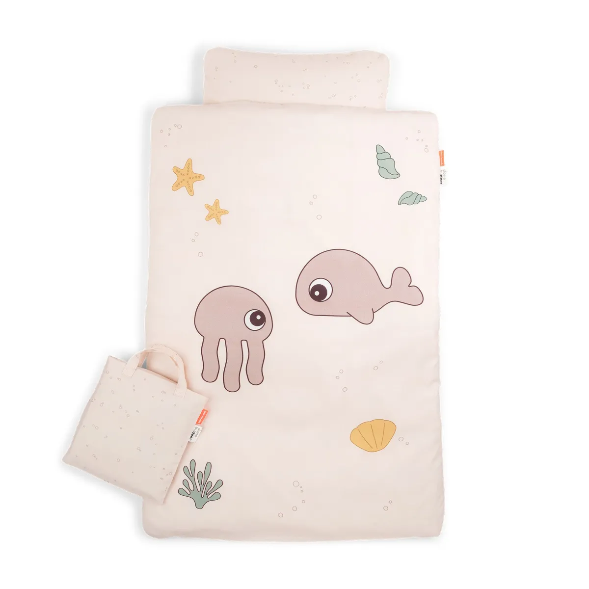 Sengesættet har en overordnet pudderfarve med havlivselementer som skaller, koralrev, søstjerner og de to Sea Friends Jelly og Wally i toner af pudder, sennep og grøn. Bagsiden er dekoreret med et sødt bobleprint, der matcher tote bagen.