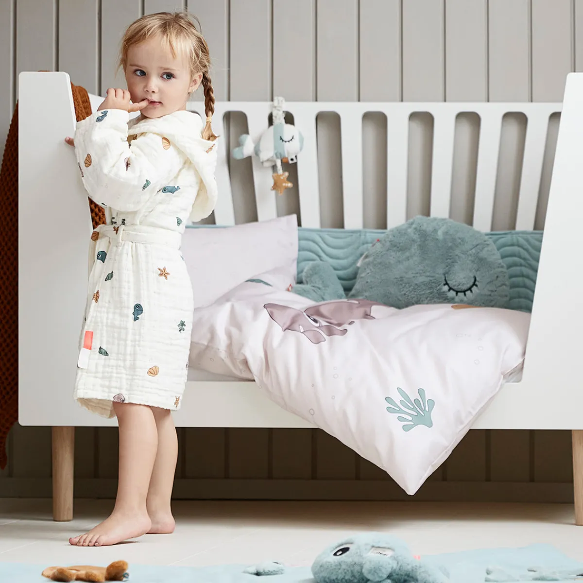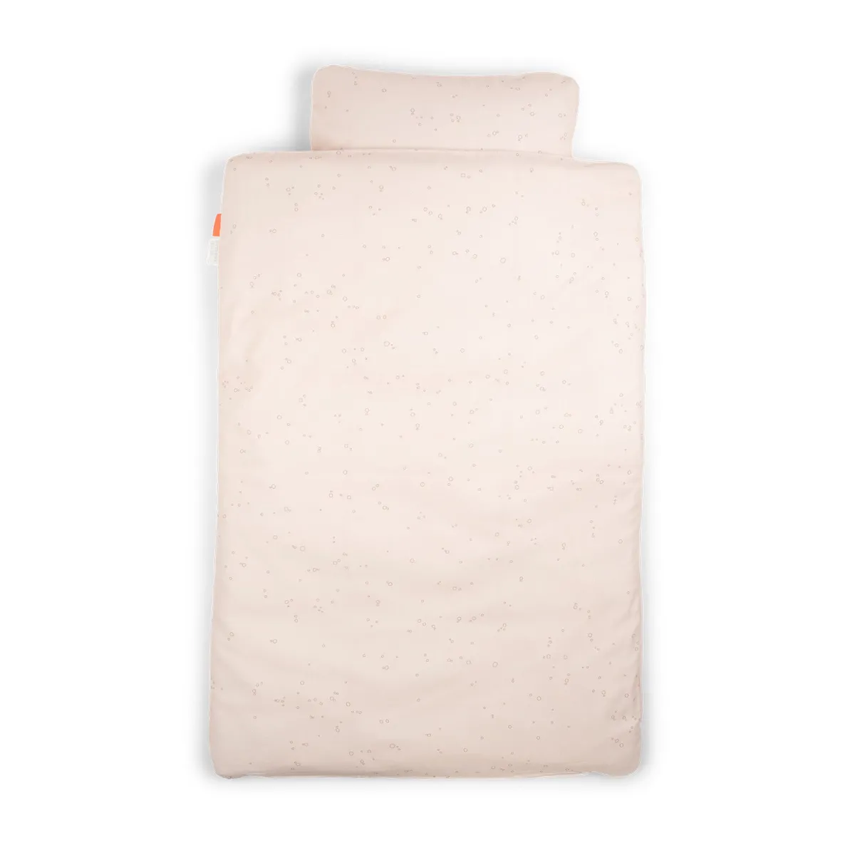 – Pakket i en lille tote bag i bomuld, der matcher sengesættet, og som kan bruges til legetøj, skiftetøj, sko eller andre praktiske formål