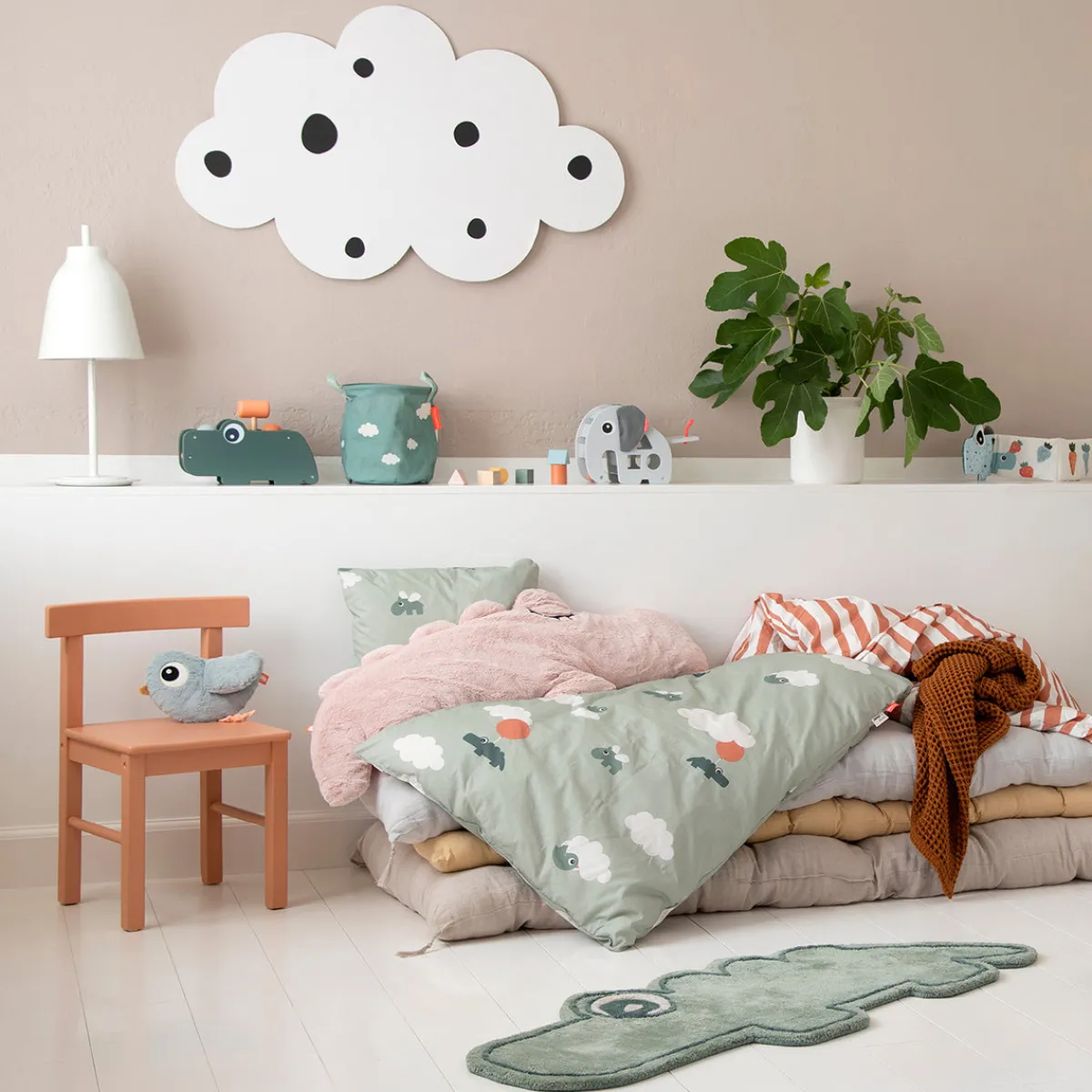 Sengesættet har en blød grøn tone og et sødt print med Birdee, Ozzo og Croco og drømmende elementer som skyer og balloner.